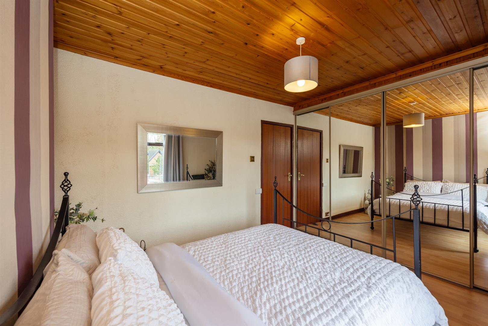 Wall to wall fitted wardrobes with mirror panelled sliding doors. Wood laminate floor covering.
