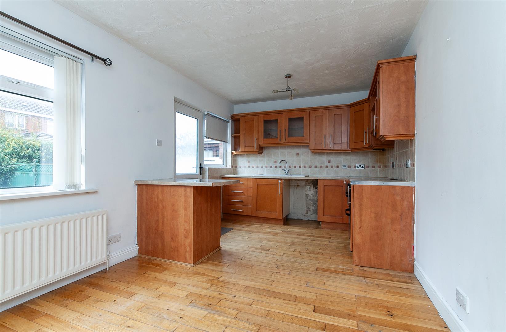 The property comprises entrance hall, lounge, kitchen through dining room, four bedrooms, and bathroom, with white three piece suite.