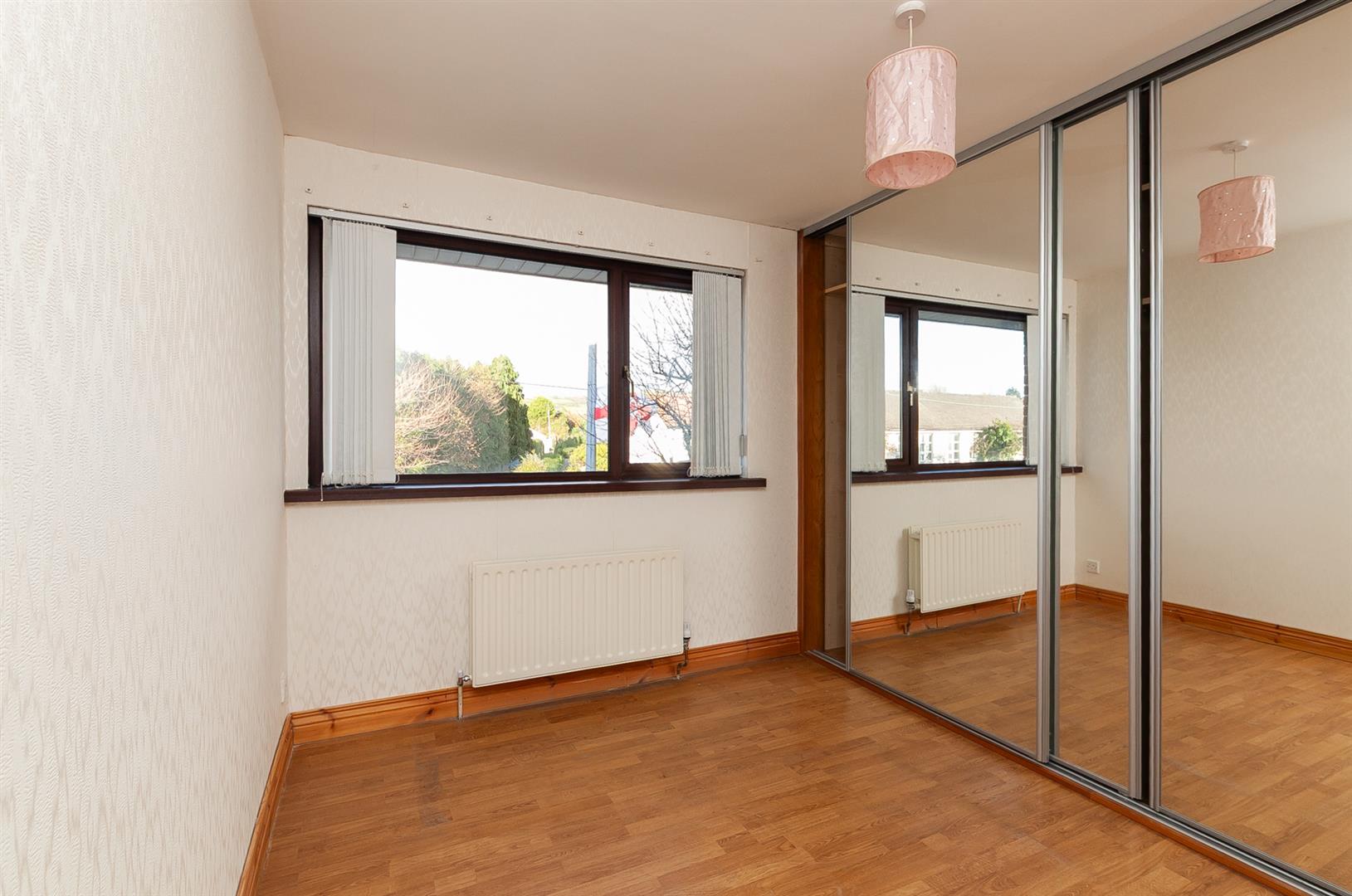 Wall to wall fitted wardrobes in mirror panelled sliding doors. Separate built in wardrobe. Wood laminate floor covering.