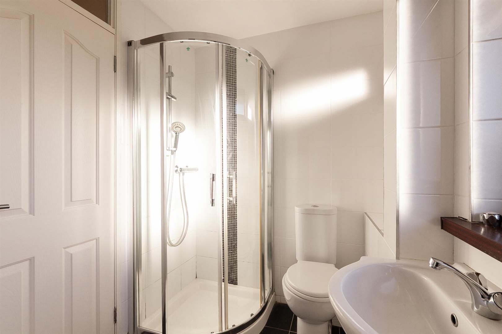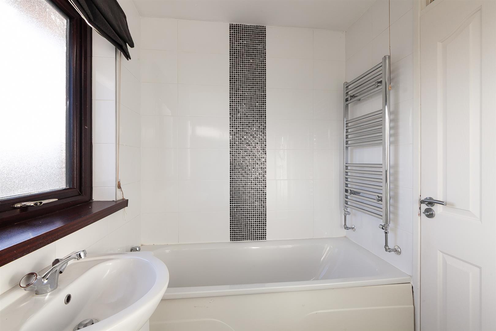 White, four piece suite comprising panelled bath, separate shower enclosure, vanity unit and WC. Thermostat controlled mains shower unit. Chrome towel radiator.
