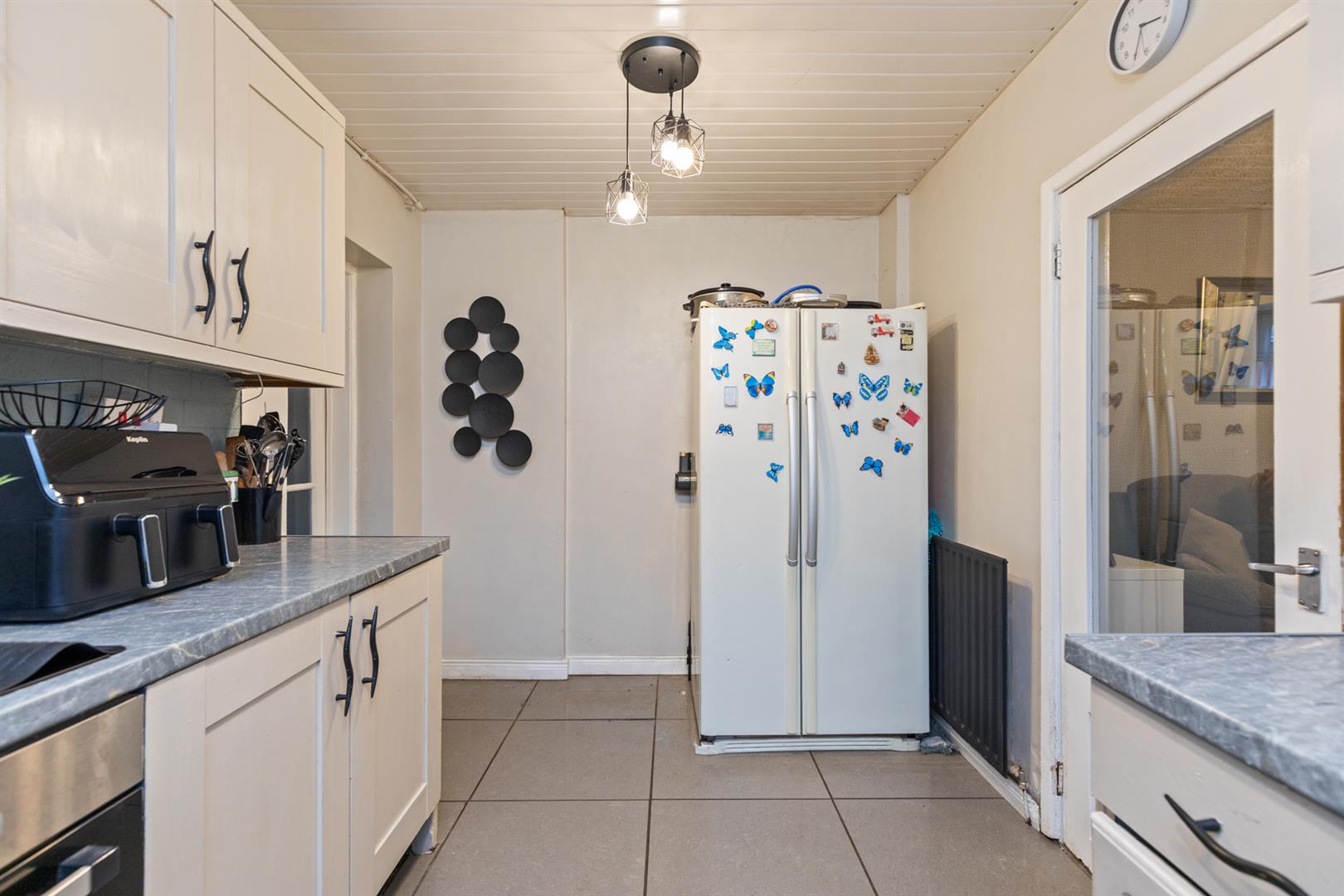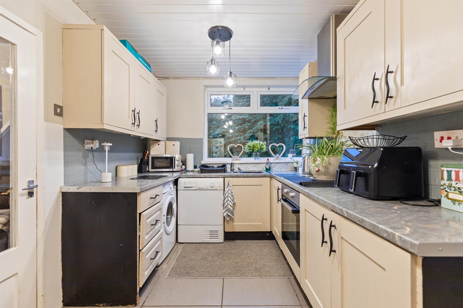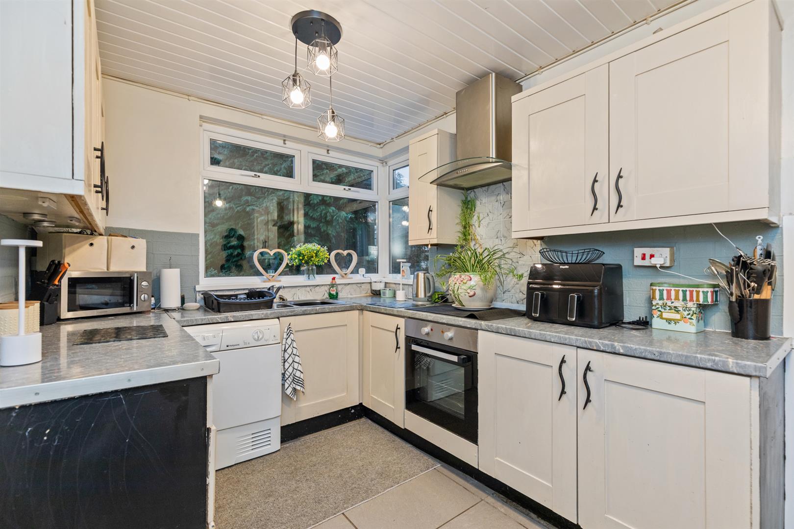 Fitted kitchen with range of high and low level storage units with contrasting melamine work surface. Stainless steel 1.5 bowl sink unit with draining bay. Integrated ceramic hob with stainless steel extractor hood over. Integrated oven. Plumbed and space for washing machine and dishwasher. Tiled floor. Dual aspect bay window to sink. Glass panelled door leading to: