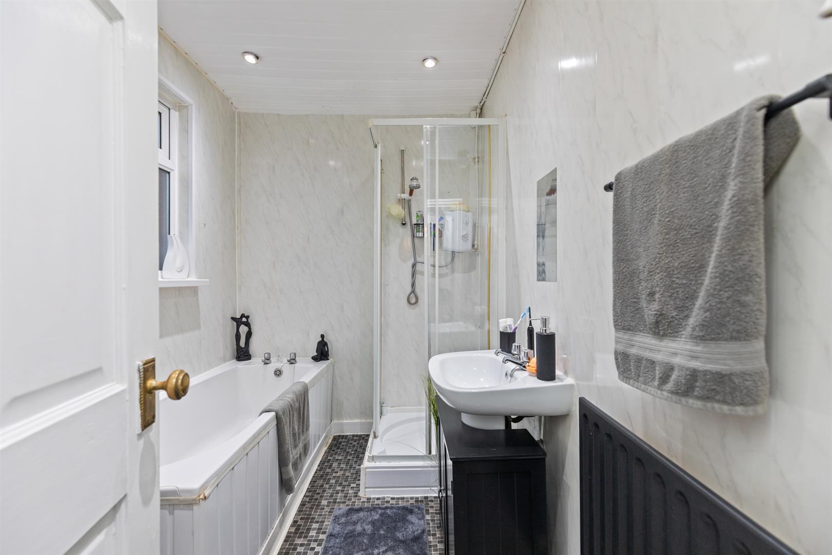White, four piece suite comprising panelled bath, separate panelled shower enclosure, pedestal wash hand basin and WC. Electric shower. Fully panelled walls.