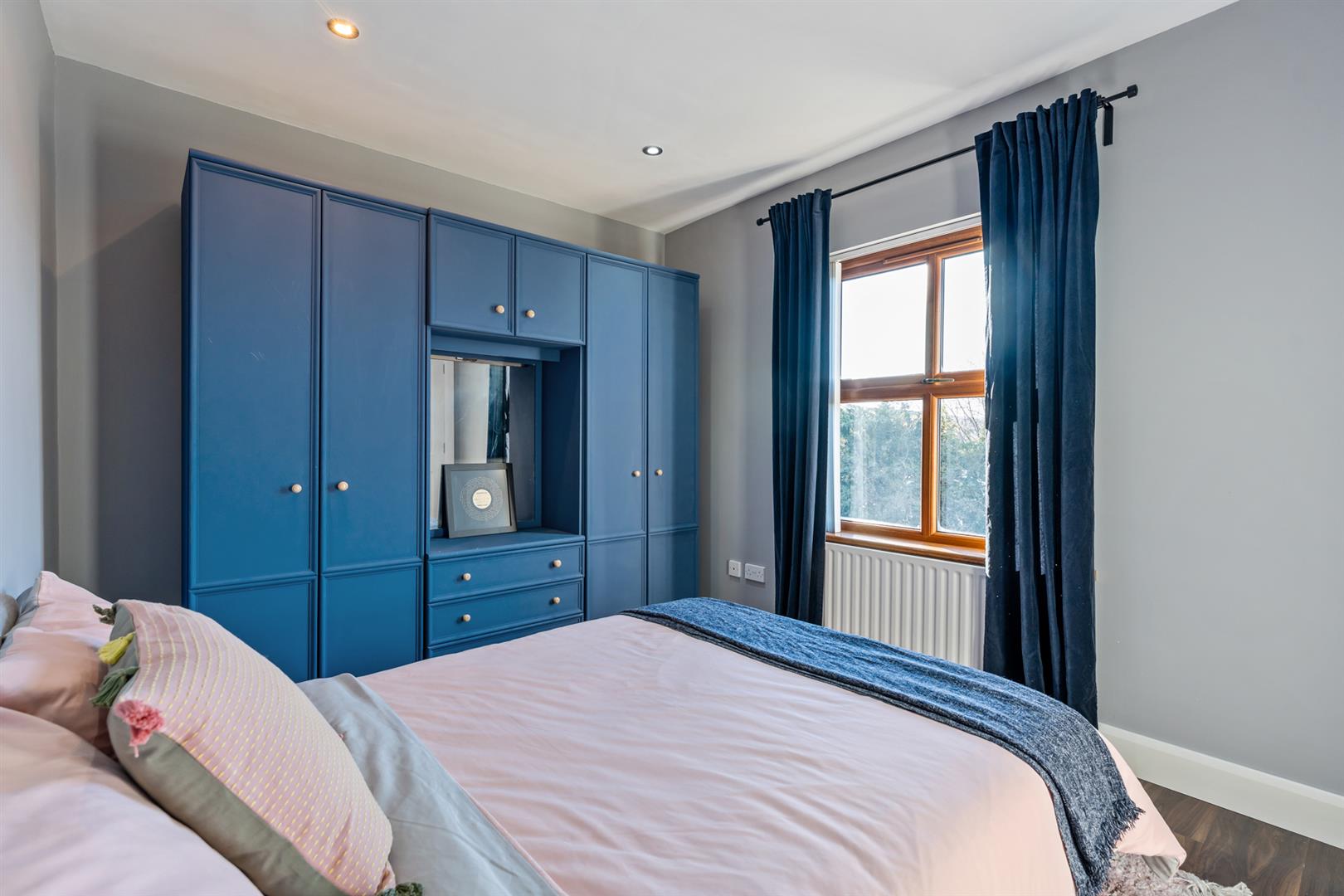 Fitted wardrobes in mirror panelled sliding doors. Wood laminate floor covering. Access to: