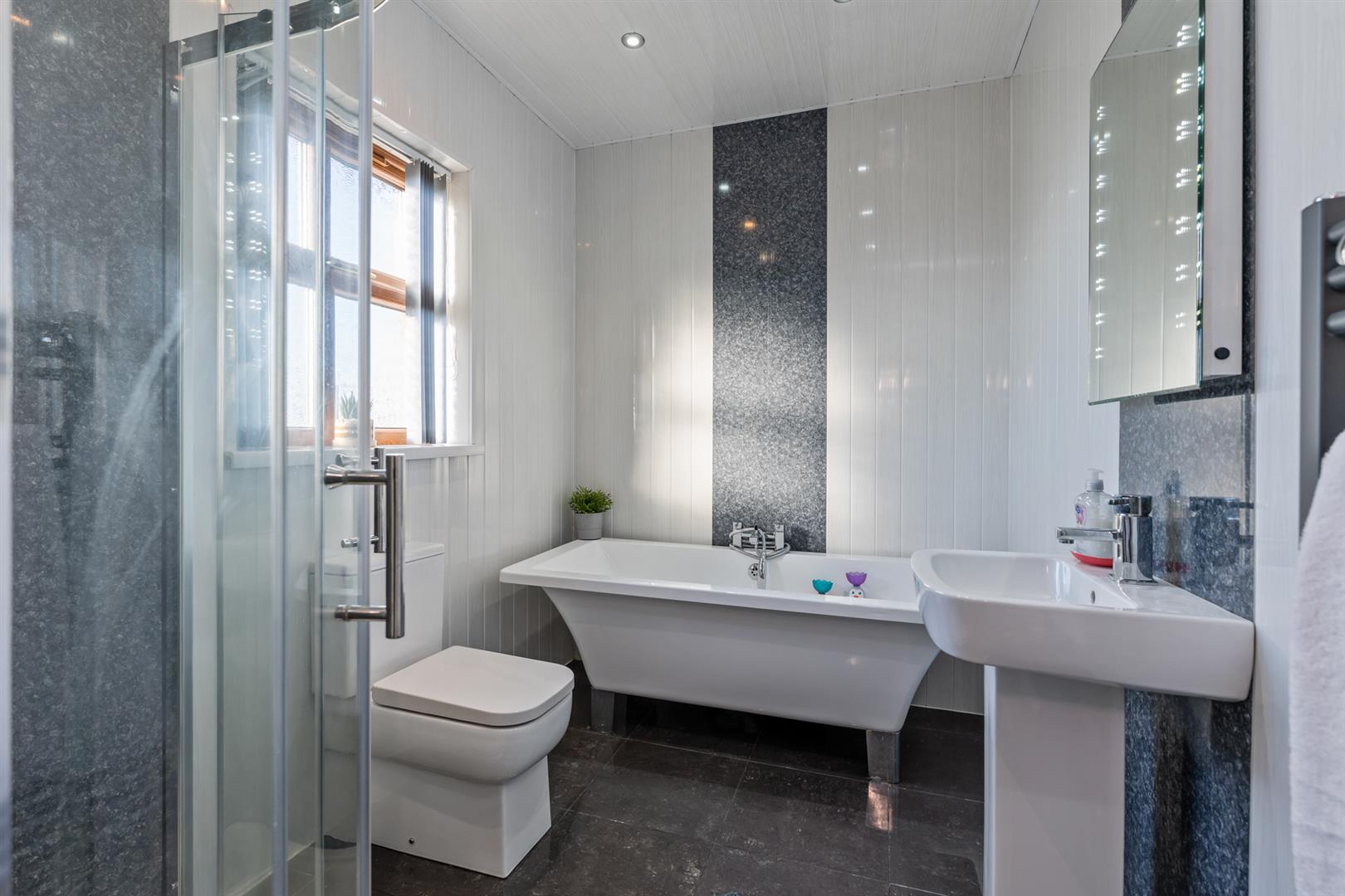 Contemporary, white, four piece suite comprising free standing bath, separate panelled shower enclosure, pedestal wash hand basin and WC. Thermostat control main shower unit. Towel radiator, Illuminated mirror over sink.