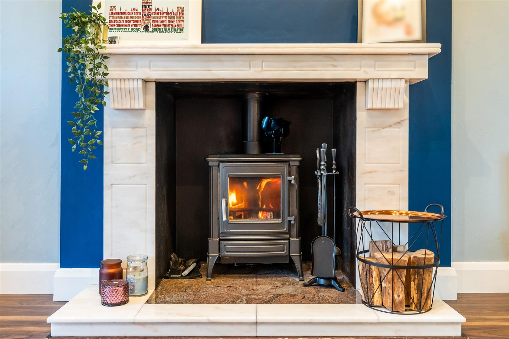 Inglenook recess with cast iron wood burning stove with granite and marble hearth and marble surround. Picture window to front elevation. Wood laminate floor covering. PVC double glazed French doors leading to: