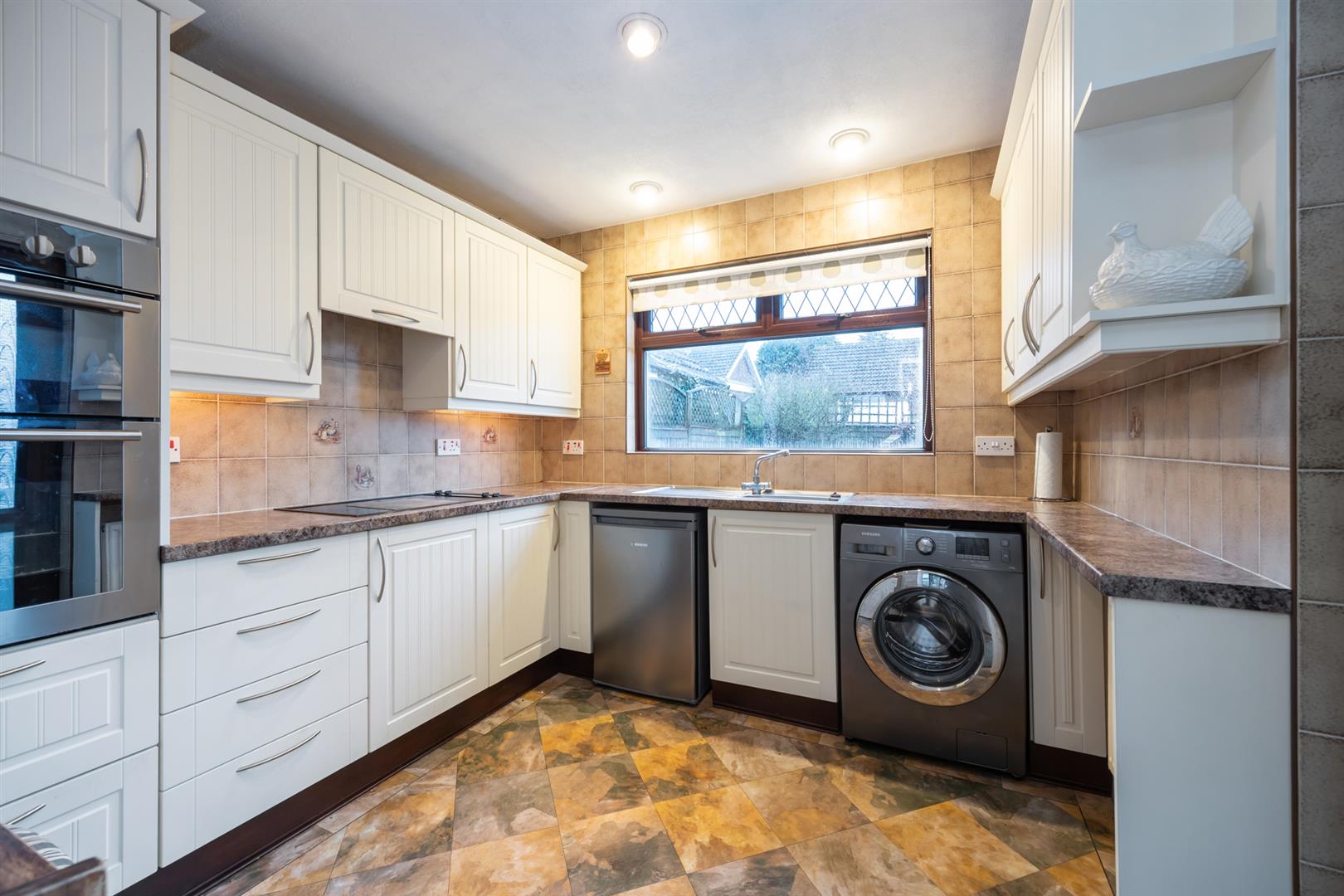 Modern fitted kitchen with range of high and low level storage units with contrasting granite effect melamine work surface. Stainless steel sink unit with draining bay. Integrated ceramic hob with extractor hood over. Plumbed and space for washing machine and dishwasher. Splashback tiling to walls. Tile effect flooring. PVC double glazed door leading to rear garden.