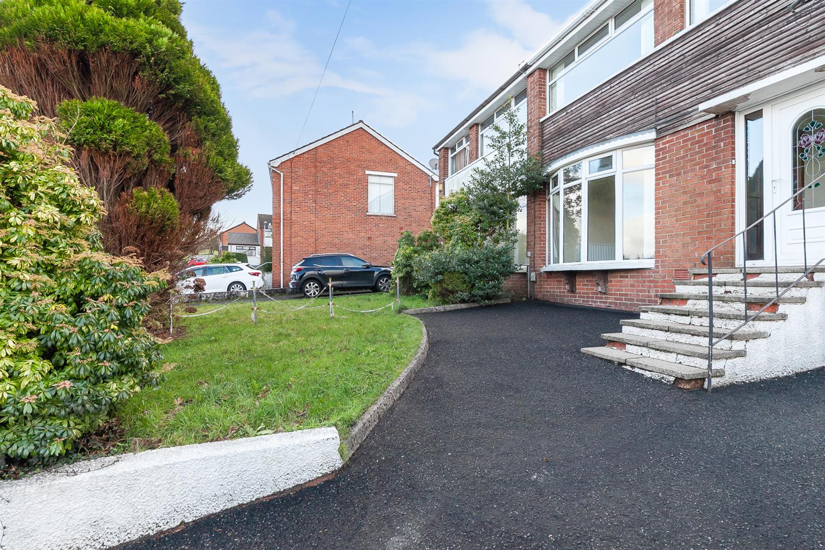Double gates leading to generous sized private driveway area finished in tarmac.