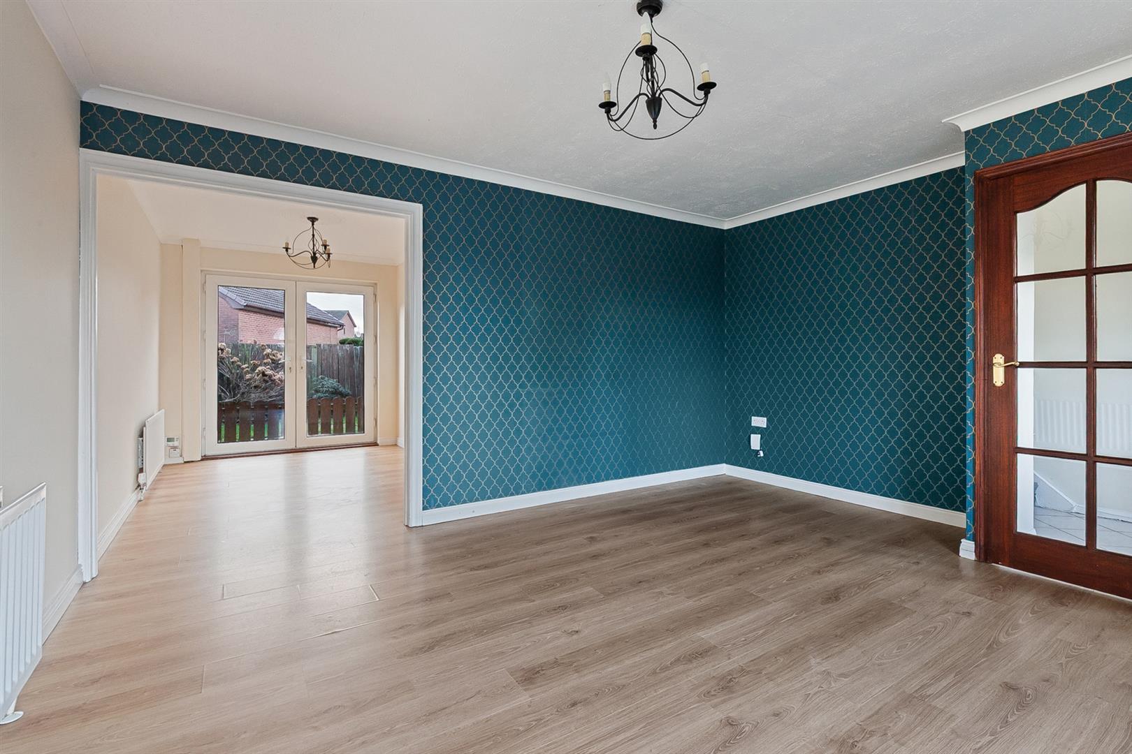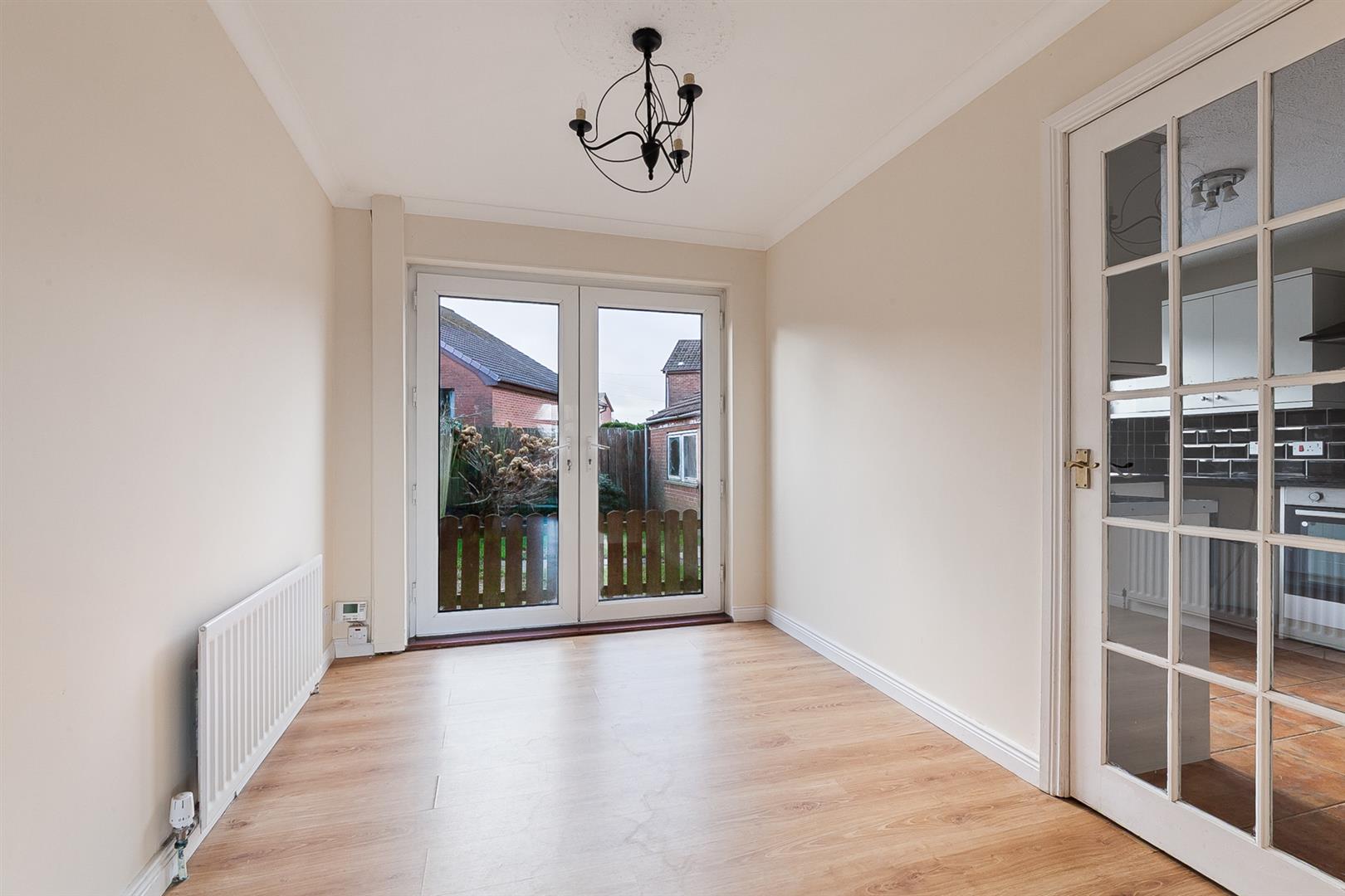 Wood laminate floor covering. PVC double glazed French doors leading to rear garden. Glass panelled door leading to:
