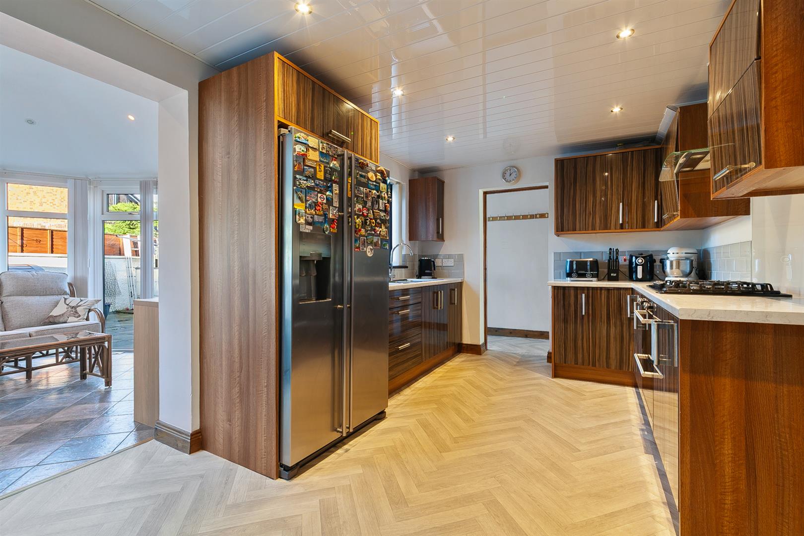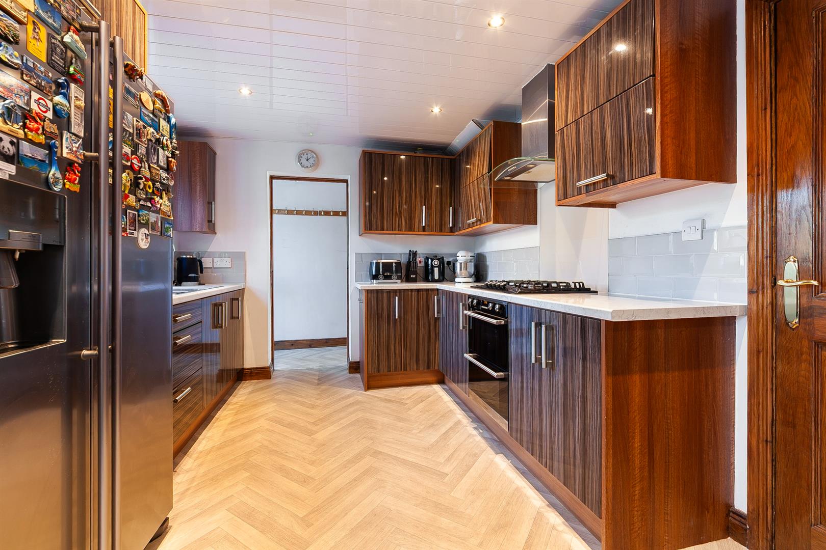 Modern fitted kitchen with range of high and low level storage units with contrasting quartz effect melamine work surface. Stainless steel 1.5 bowl sink unit with draining bay. Integrated gas hob with glass splashback and stainless steel extractor hood over. Integrated double oven. Space for American style fridge freezer. Splashback tiling to walls. Open arch leading to: