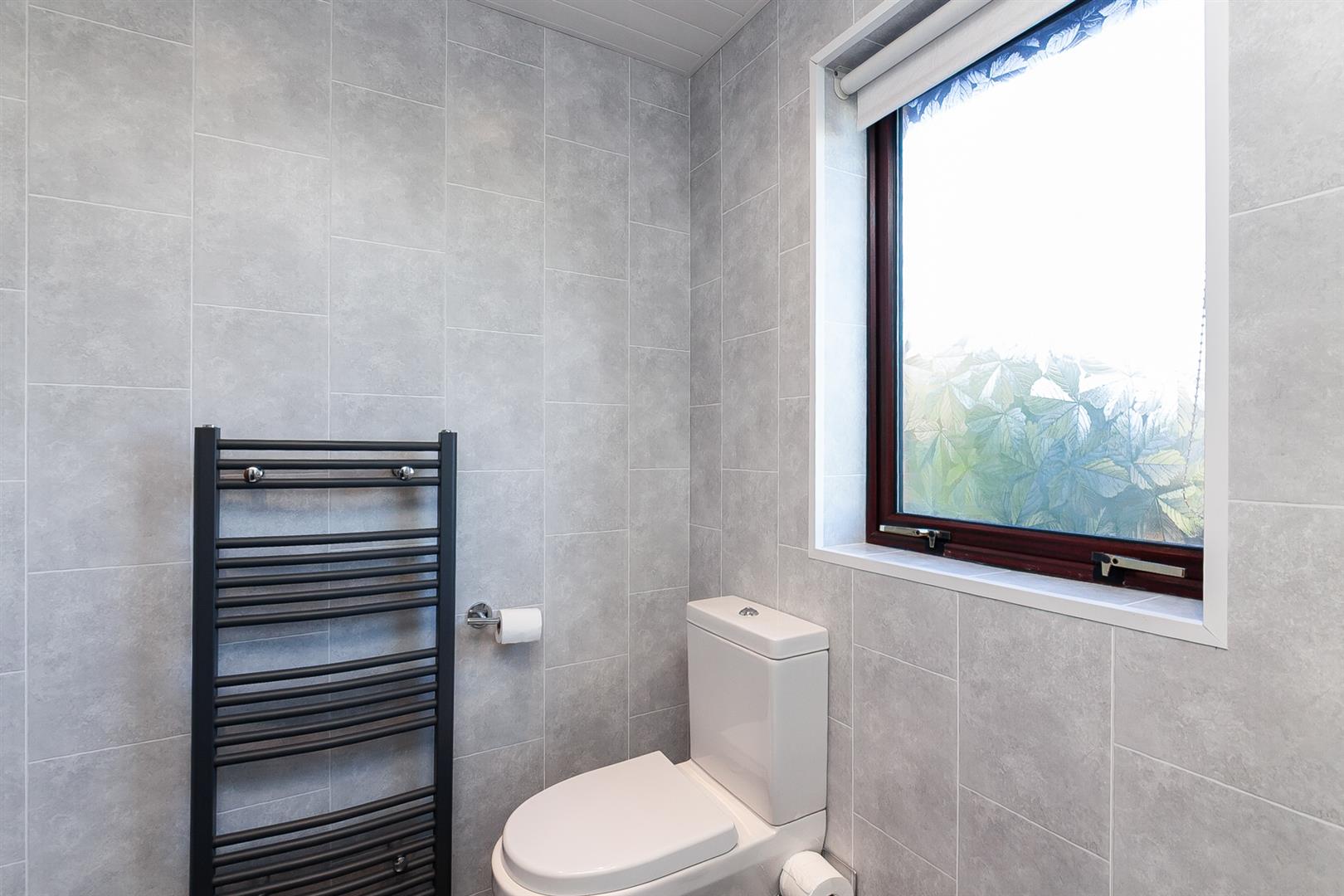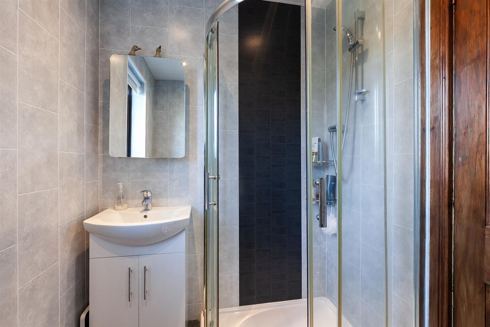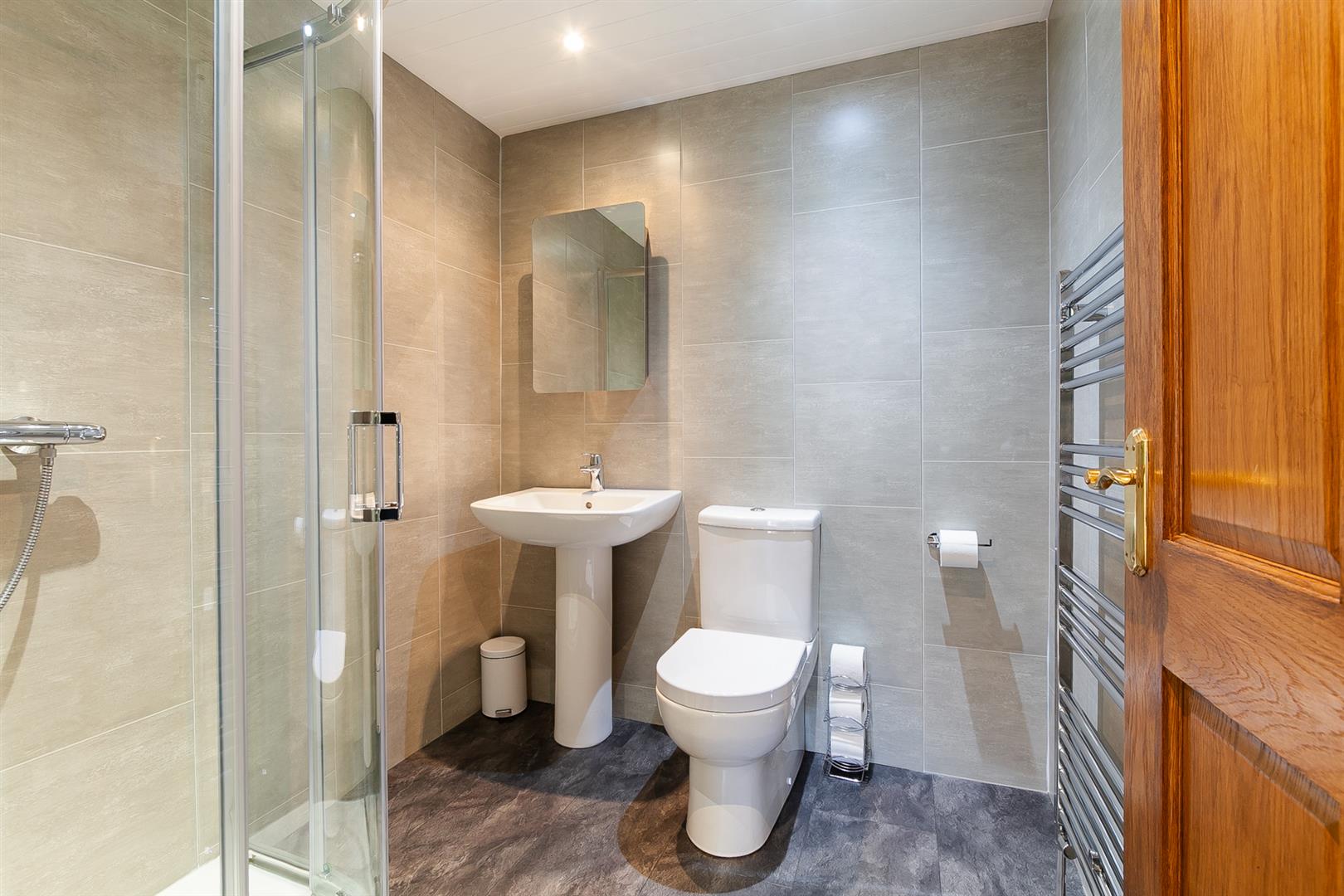 Contemporary, white three piece suite comprising fully panelled shower enclosure, pedestal wash hand basin and WC. Thermostat controlled main shower unit. Chrome towel radiator. Tile effect panelling to walls. Tile effect flooring.