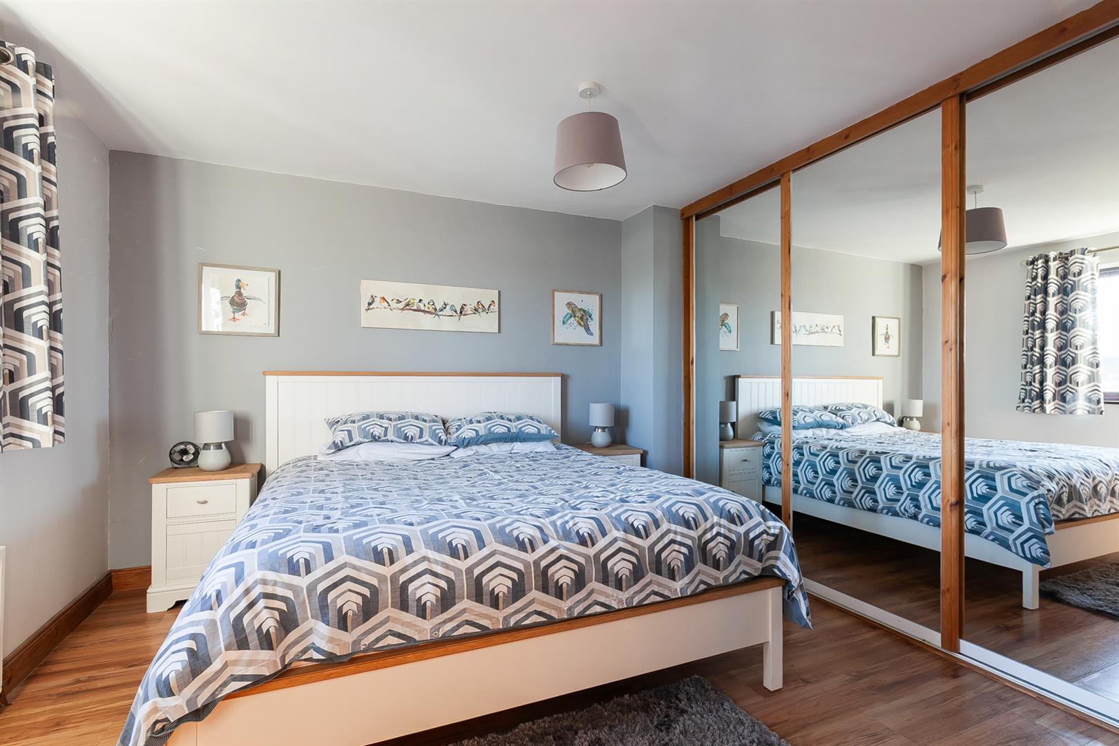 Fitted wardrobes in mirror panelled sliding doors. Wood laminate floor covering.