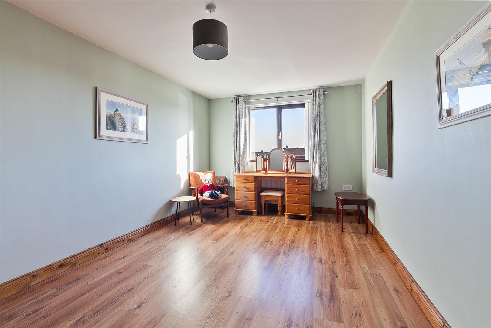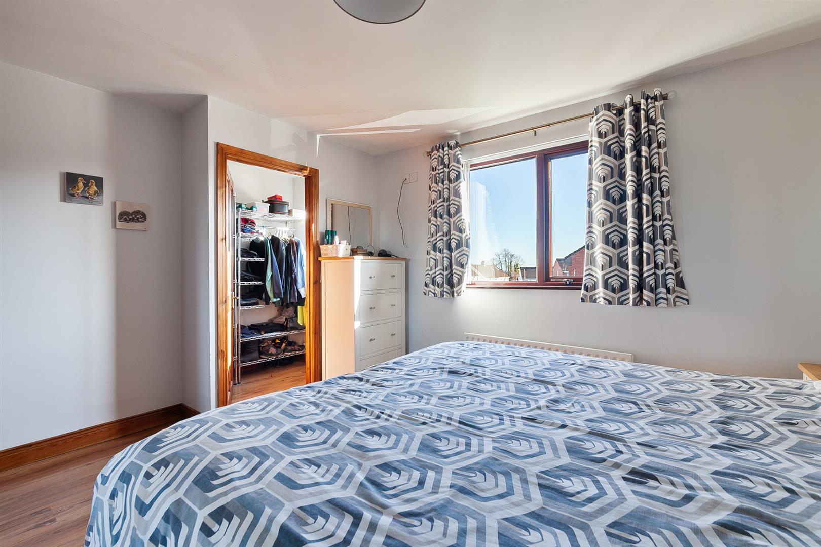 Wall to wall fitted wardrobes in mirror panelled sliding doors. Wood laminate floor covering. Walk in wardrobe/dressing room.