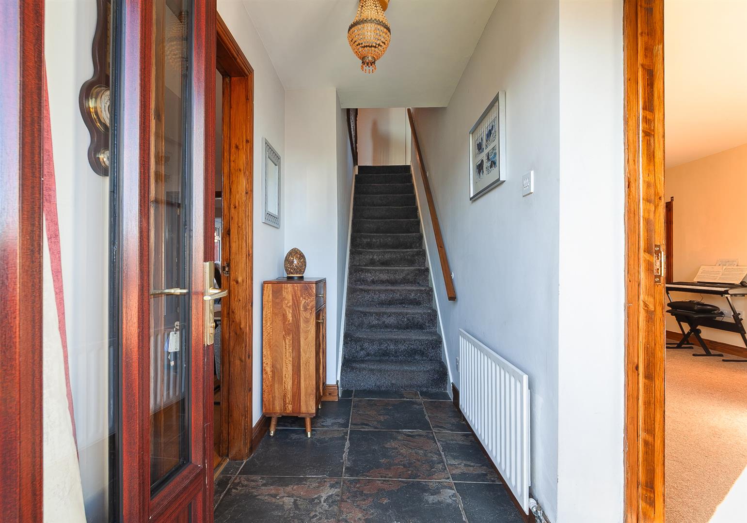 PVC double glazed front door with matching side screen. Tiled floor. Stairwell to first floor.