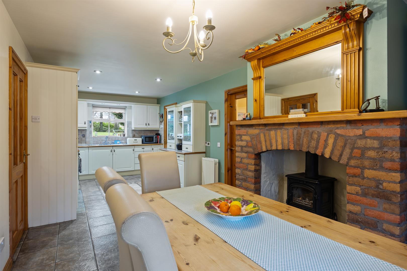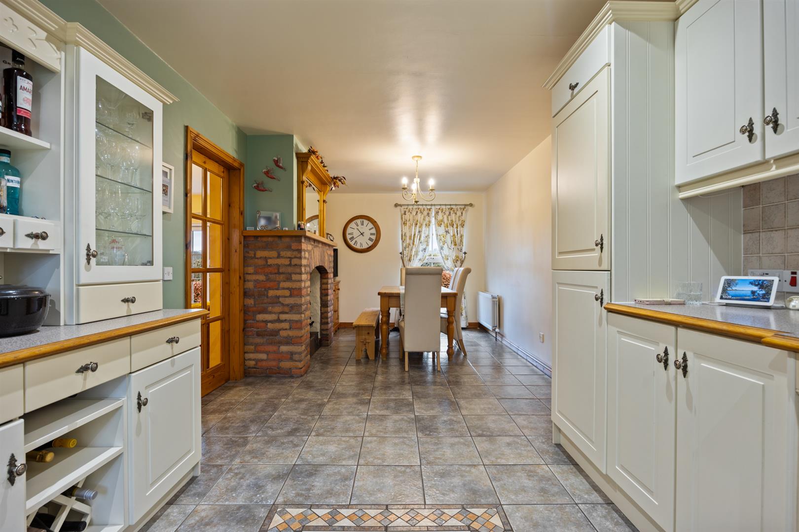 Country style fitted kitchen with range of high and low level storage units with contrasting granite effect melamine work surface. Stainless steel 1.5 bowl sink unit with draining bay. Integrated touch screen with ceramic hob with extractor hood over. Integrated oven, fridge freezer and dishwasher. Matching dresser unit with glass fronted display cabinets and built in wine rack. Splashback tiling to walls. Tiled floor. Brick inglenook recess with cast iron stove to dining area. Glass panelled doors leading to family room and utility room.