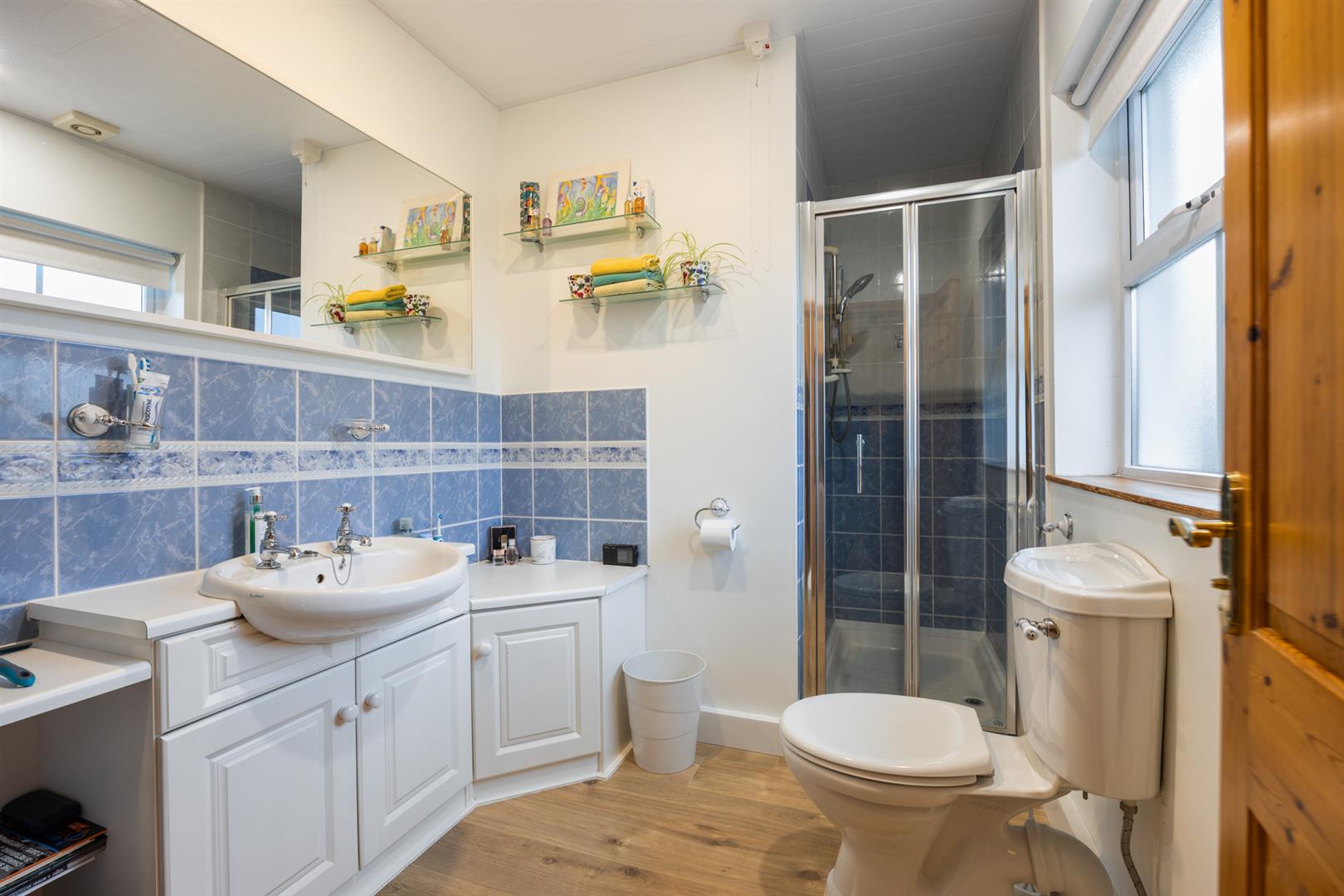 White, three piece suite comprising fully tiled oversized shower enclosure, vanity unit and WC. Electric shower. Chrome towel radiator. Part tiling to walls. Wood laminate floor covering.