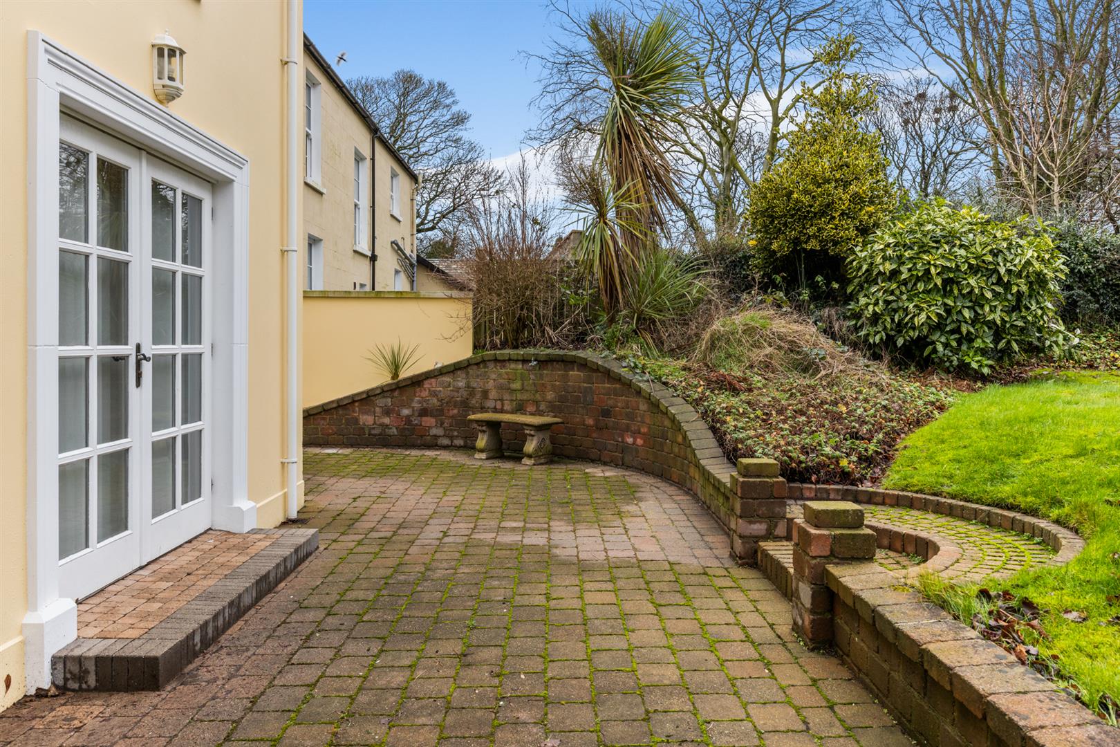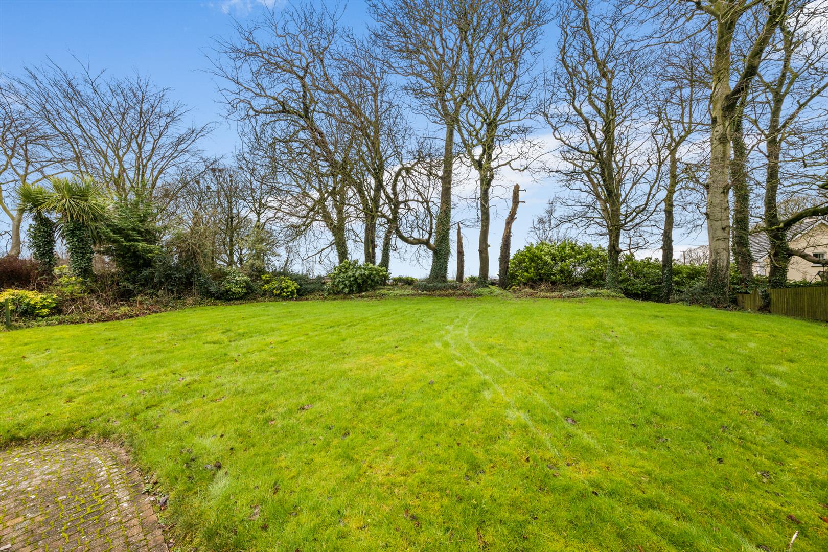 Rear garden finished in lawn, brick paviour, decorative stone and mature trees.