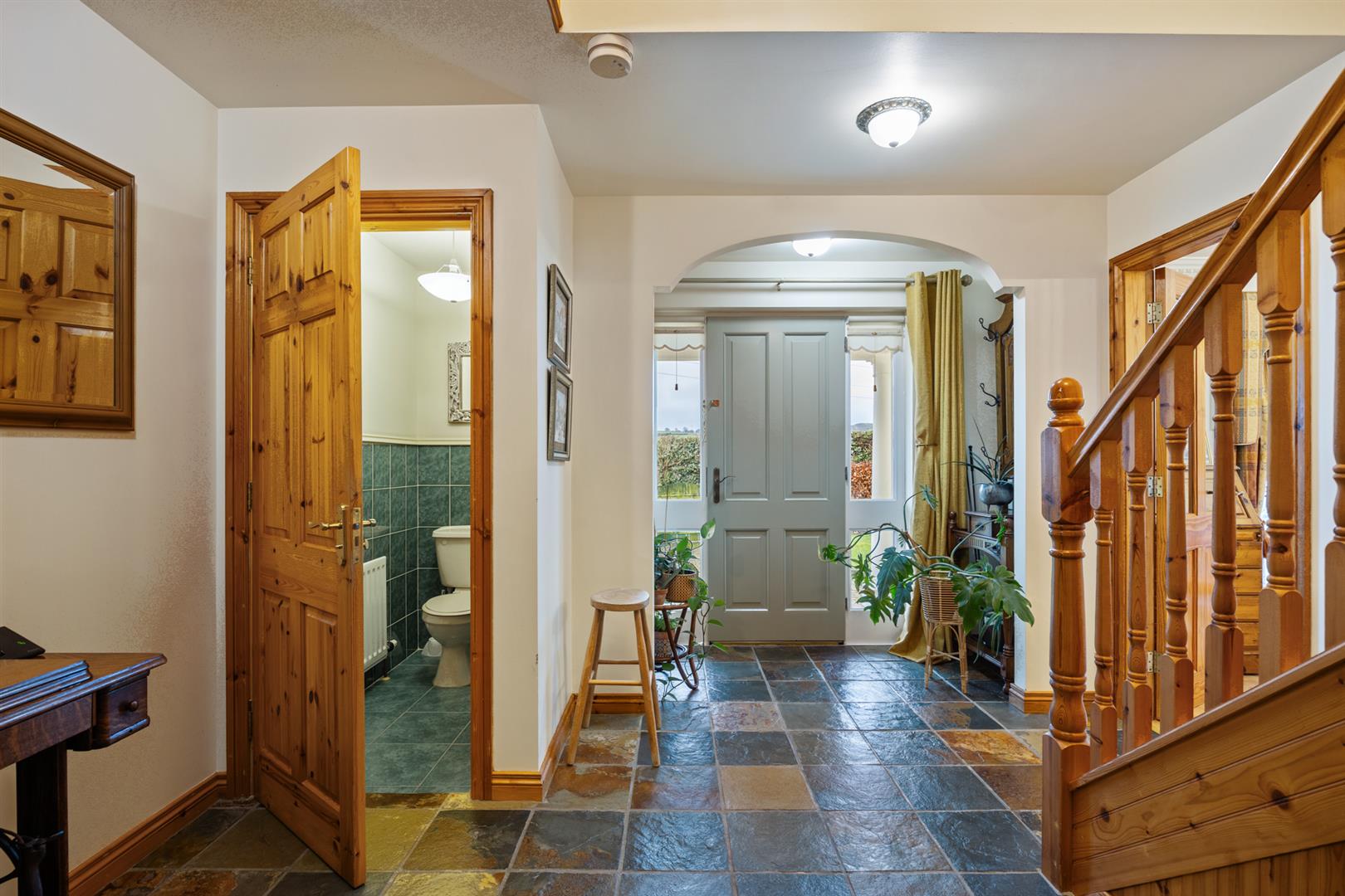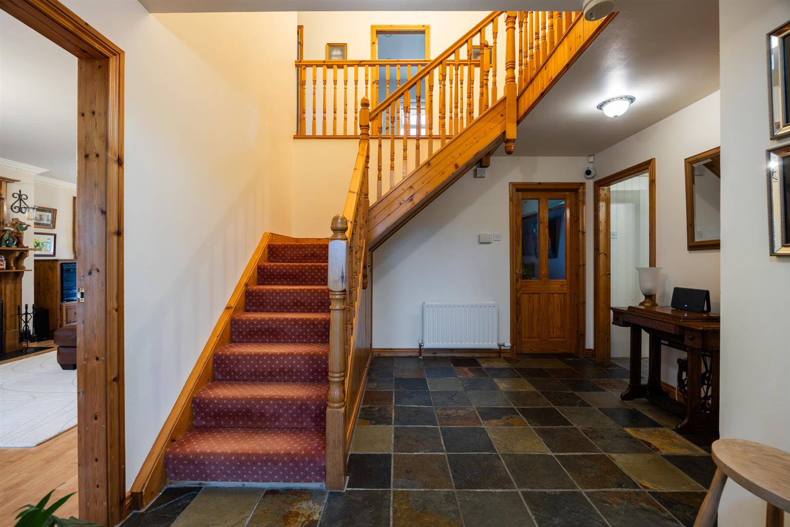 Hardwood panelled front door with matching double glazed side screens. Chinese slate floor. Stairwell to gallery style landing. Access to under stairs store. Glass panelled door to lounge dining room and kitchen.