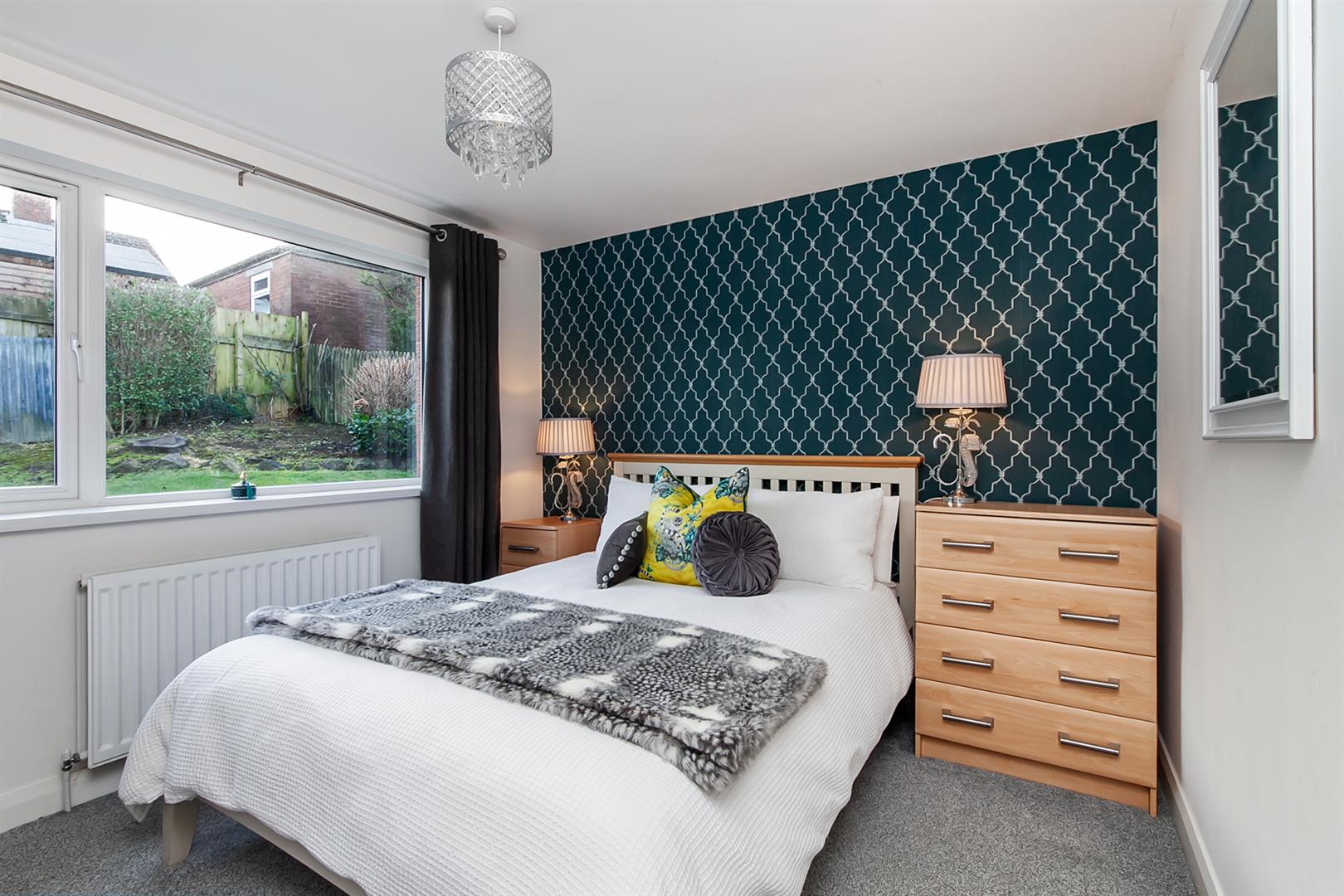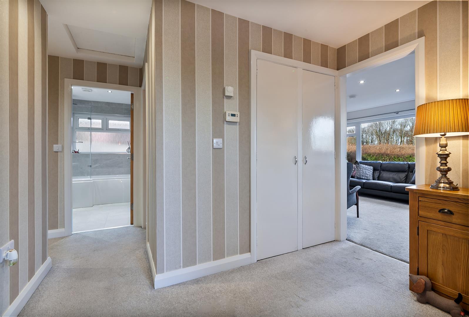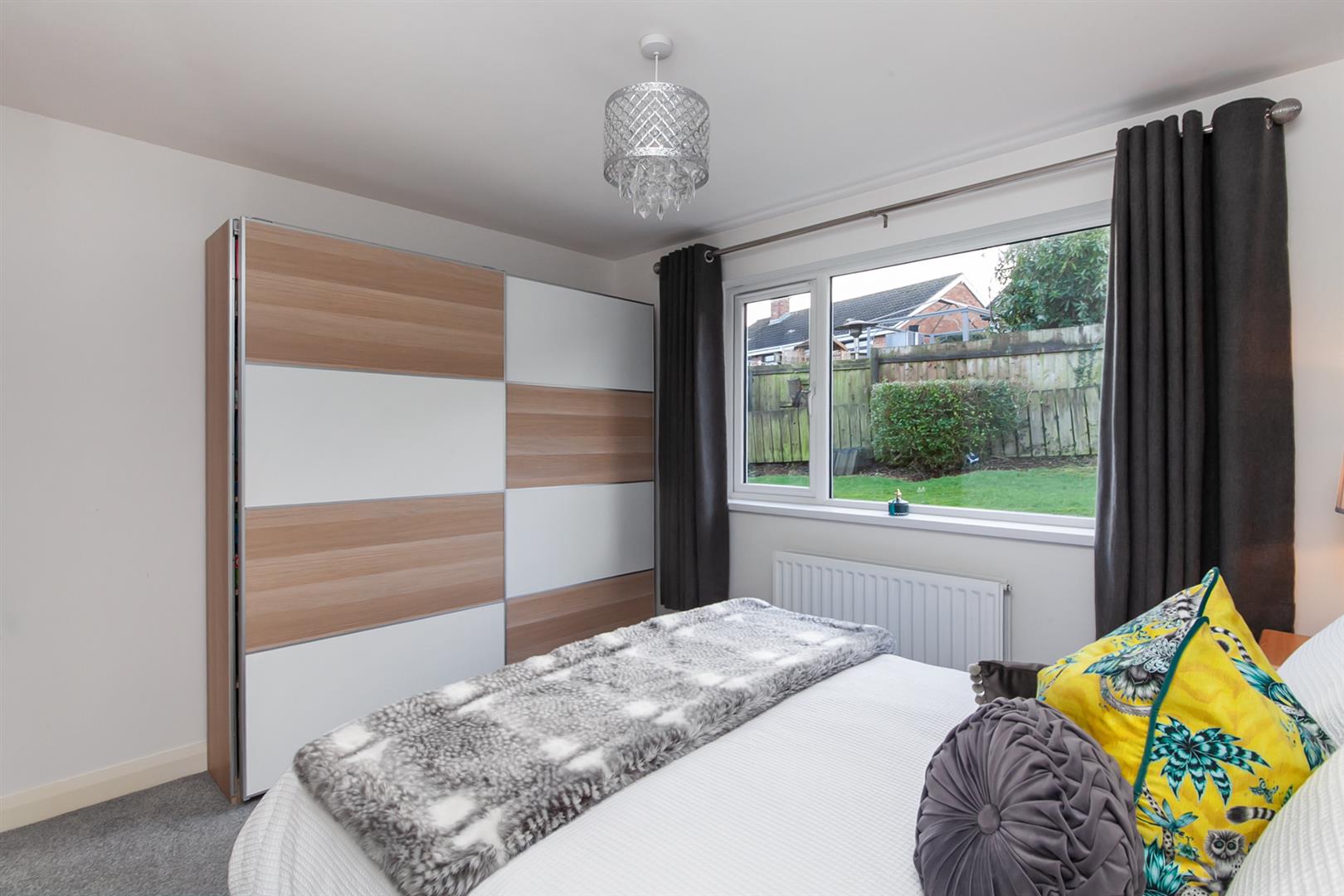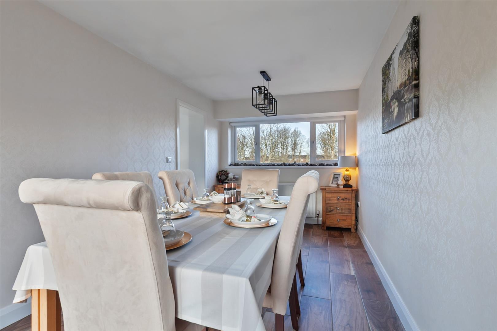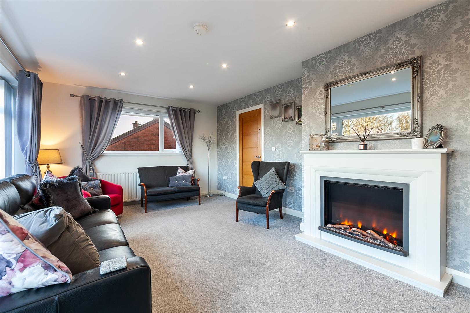 Contemporary focal point fireplace. Dual aspect windows. Picture window to front elevation.
