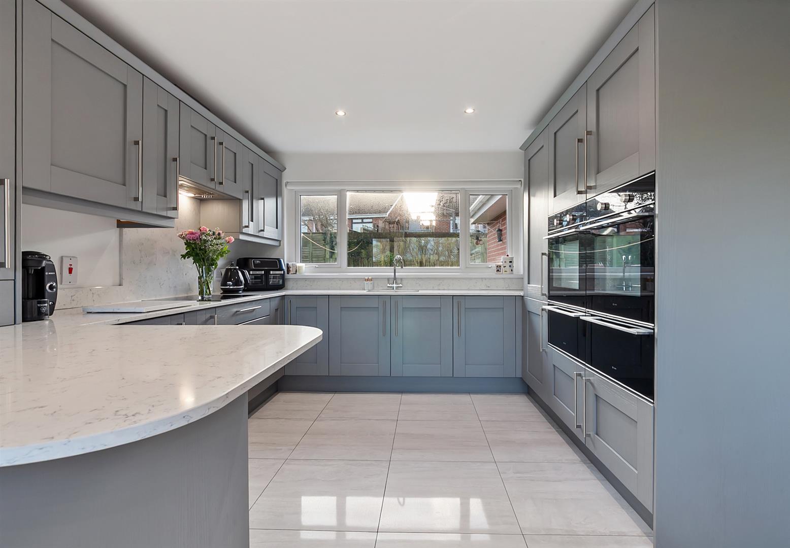 Luxury fitted kitchen with comprehensive range of high and low level storage units, with contrasting quartz worktop and matching breakfast bar area. Inlaid stainless steel sink unit. Integrated touch screen induction hob with extractor hood over. Integrated double oven and warming trays. Quartz upstands and splashback to walls. Dual aspect windows. Tiled floor.