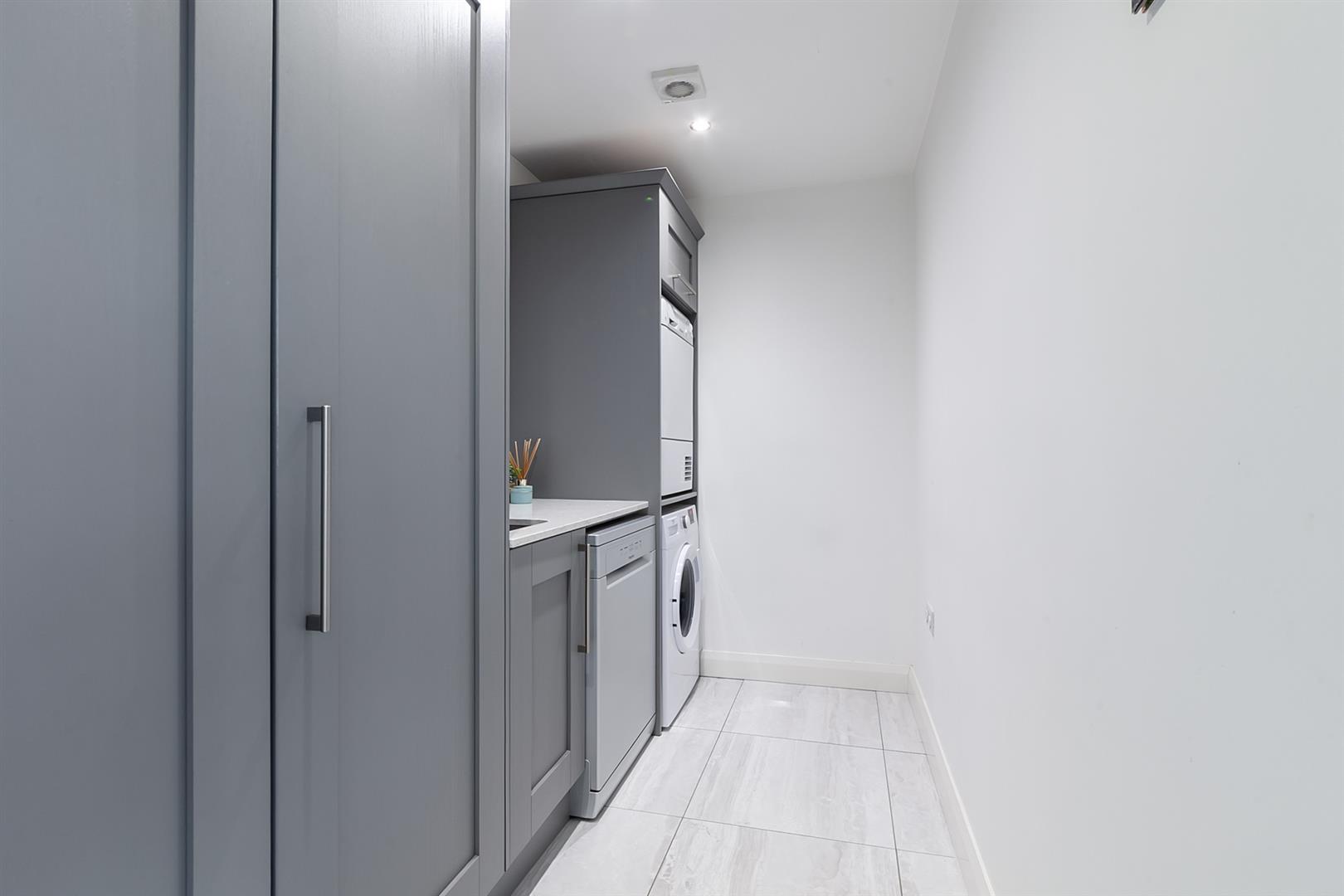 Fitted storage units with contrasting quartz worktop. Inlaid stainless steel sink unit. Integrated larder fridge. Separate integrated larder freezer. Plumbed and space for washing machine. Plumbed and space for dishwasher. Space for tumble dryer. Quartz upstand to wall. Tiled floor.