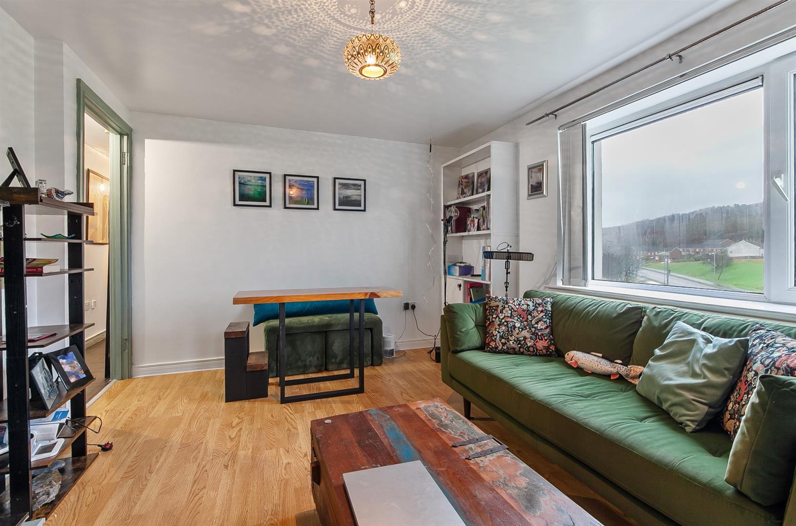 View towards Carnmoney Hill. Wood laminate floor covering.