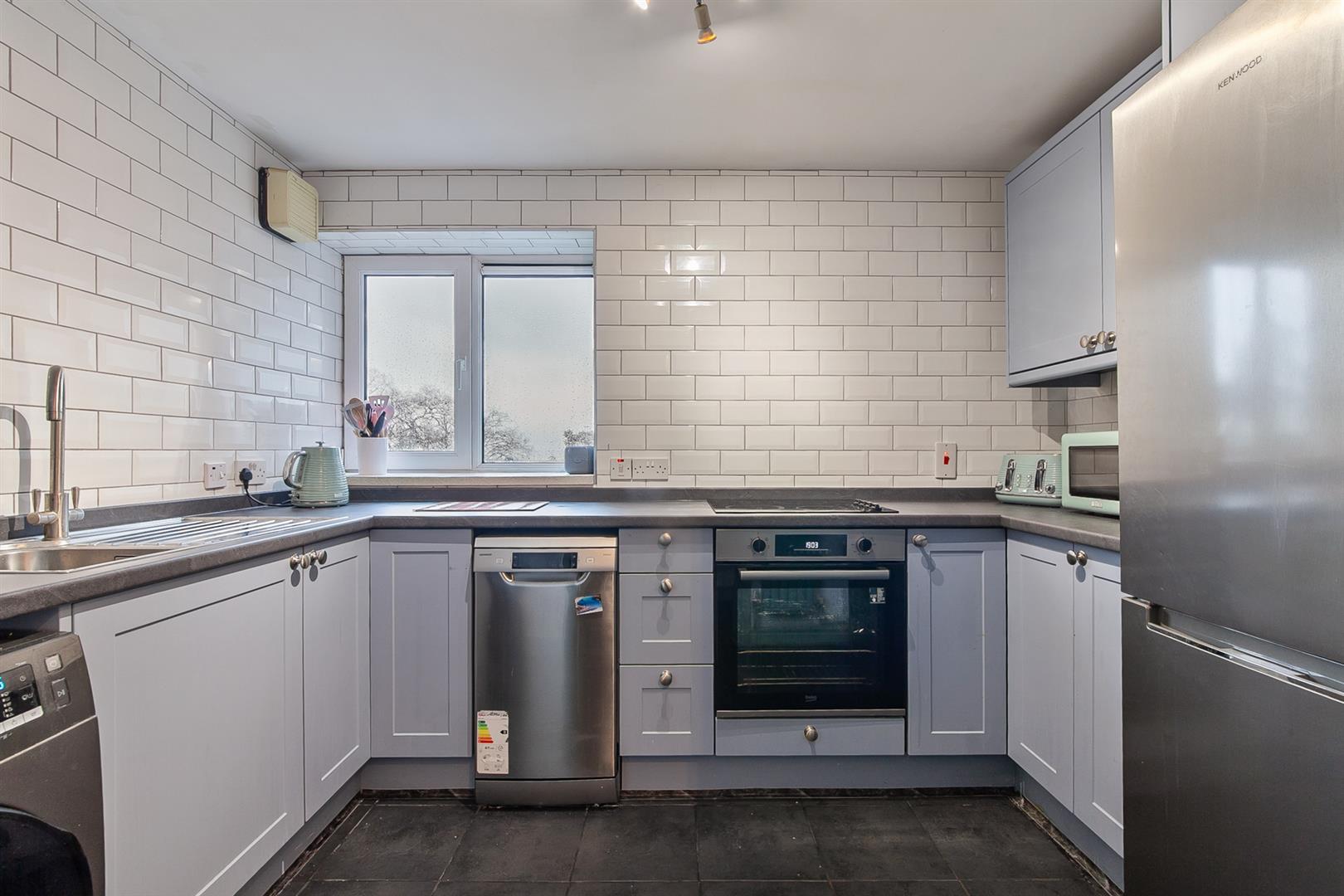 Modern fitted kitchen with range of high and low level storage units with contrasting granite effect melamine work surface. Stainless steel sink unit with draining bay. Integrated ceramic hob with integrated oven below. Space for fridge freezer. Plumbed and space for washing machine. Plumbed and space for slimline dishwasher. Part tiling to walls. Tiled floor.