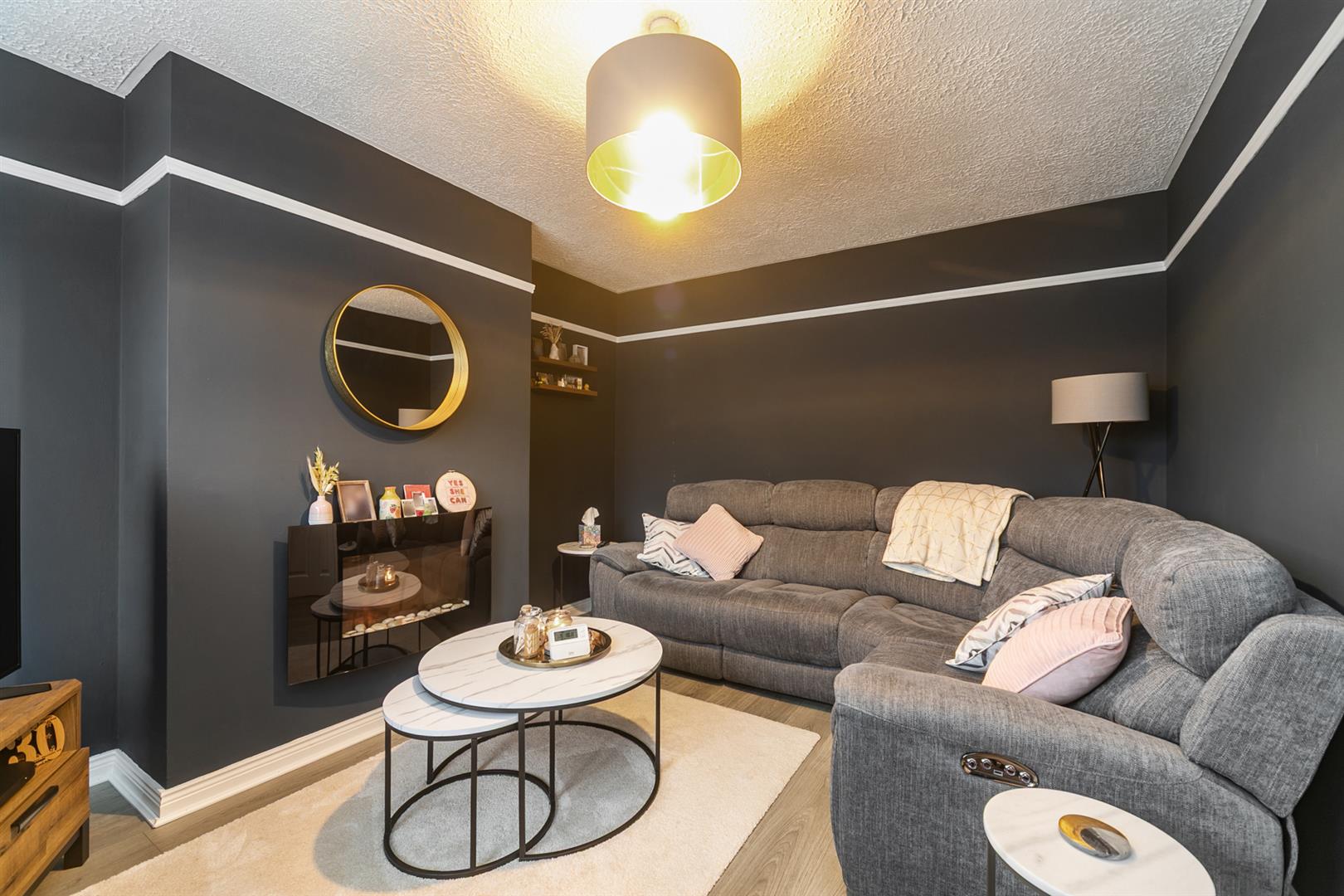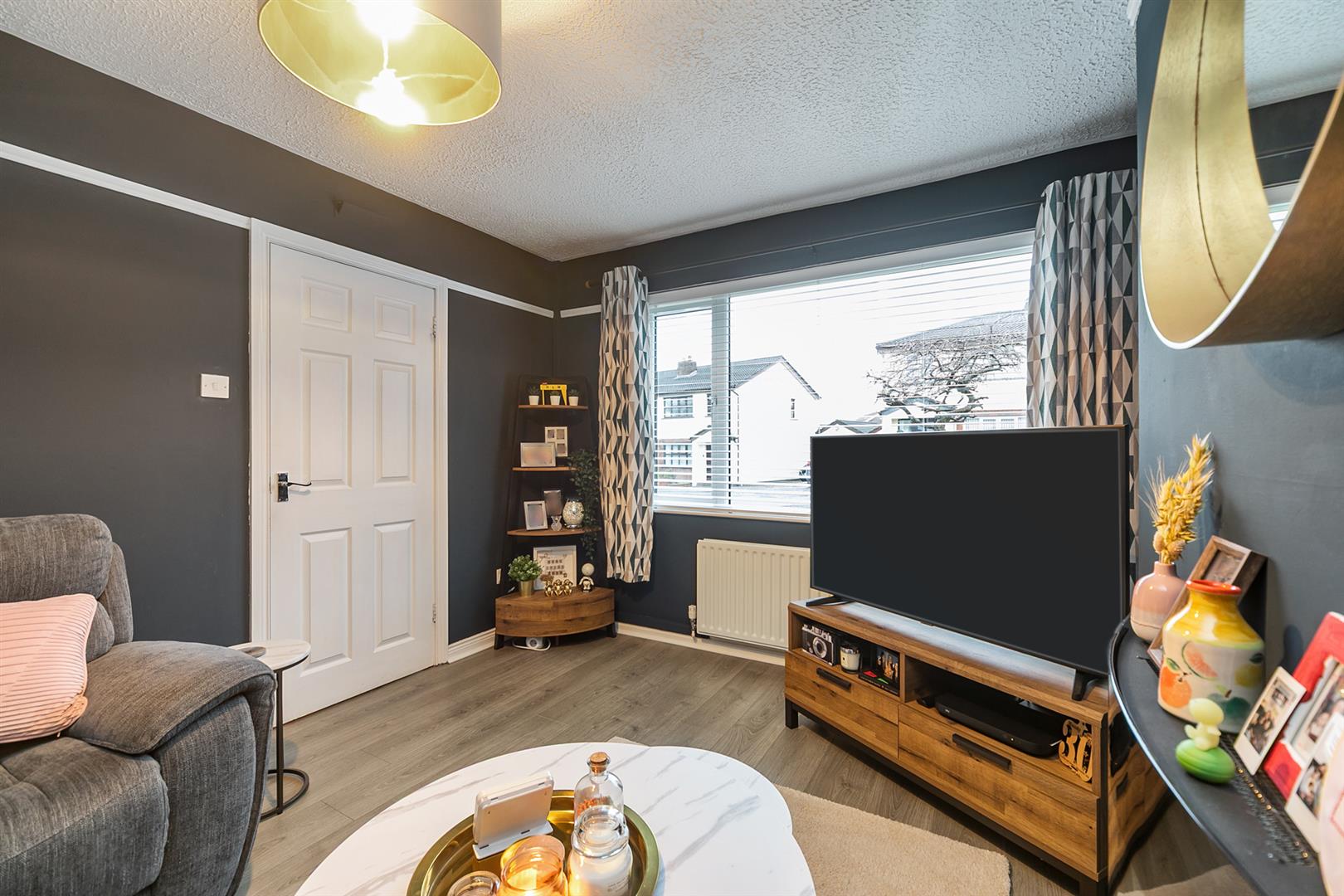 Focal point, wall mounted, electric fire. Wood laminate floor covering.