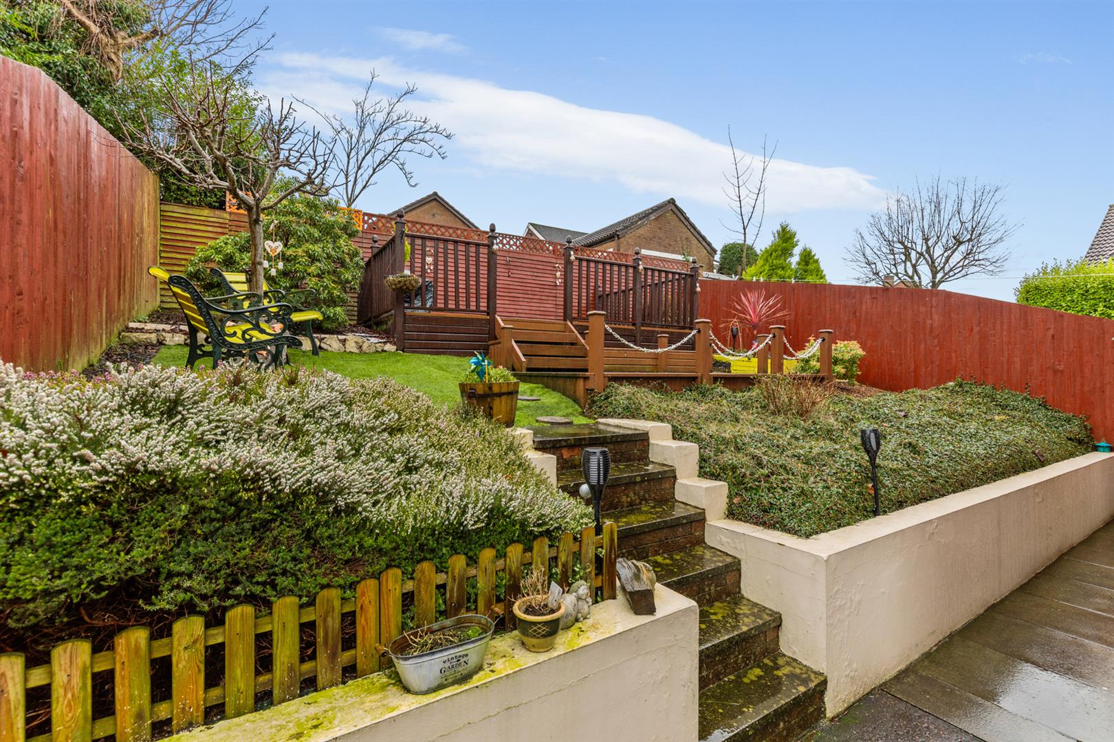 Fully landscaped garden finished in timber decking, artificial grass, tree bark, paving and range of plants trees and shrubbery
