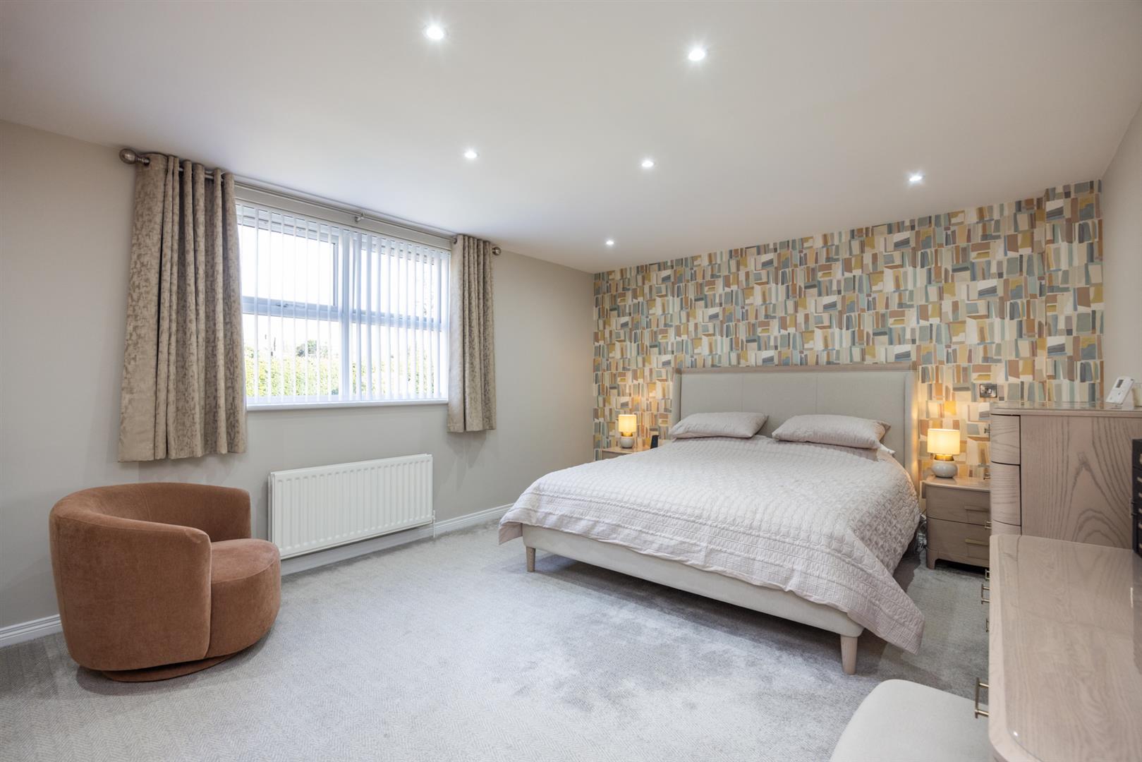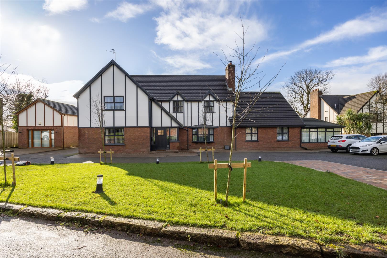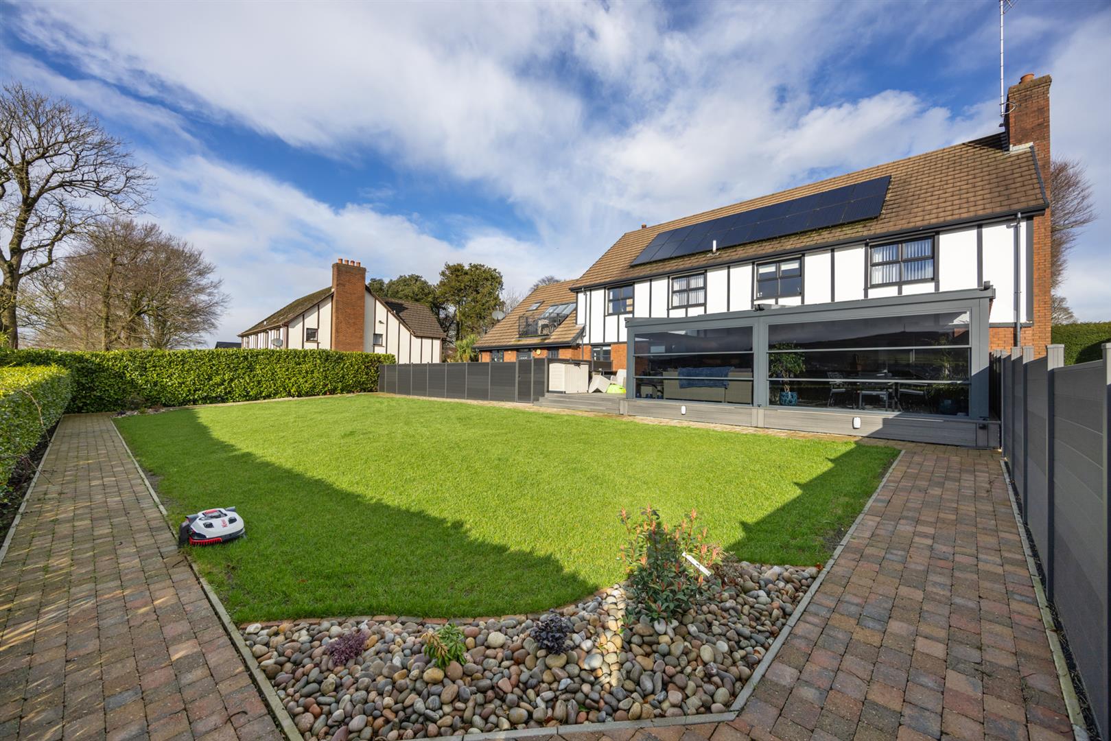 Externally, the property enjoys private driveway area finished in tarmac and brick pavior, twin garages, entertainment sized garden room with remote operated, retractable roof and walls, and fully enclosed rear garden finished in lawn and patio areas.