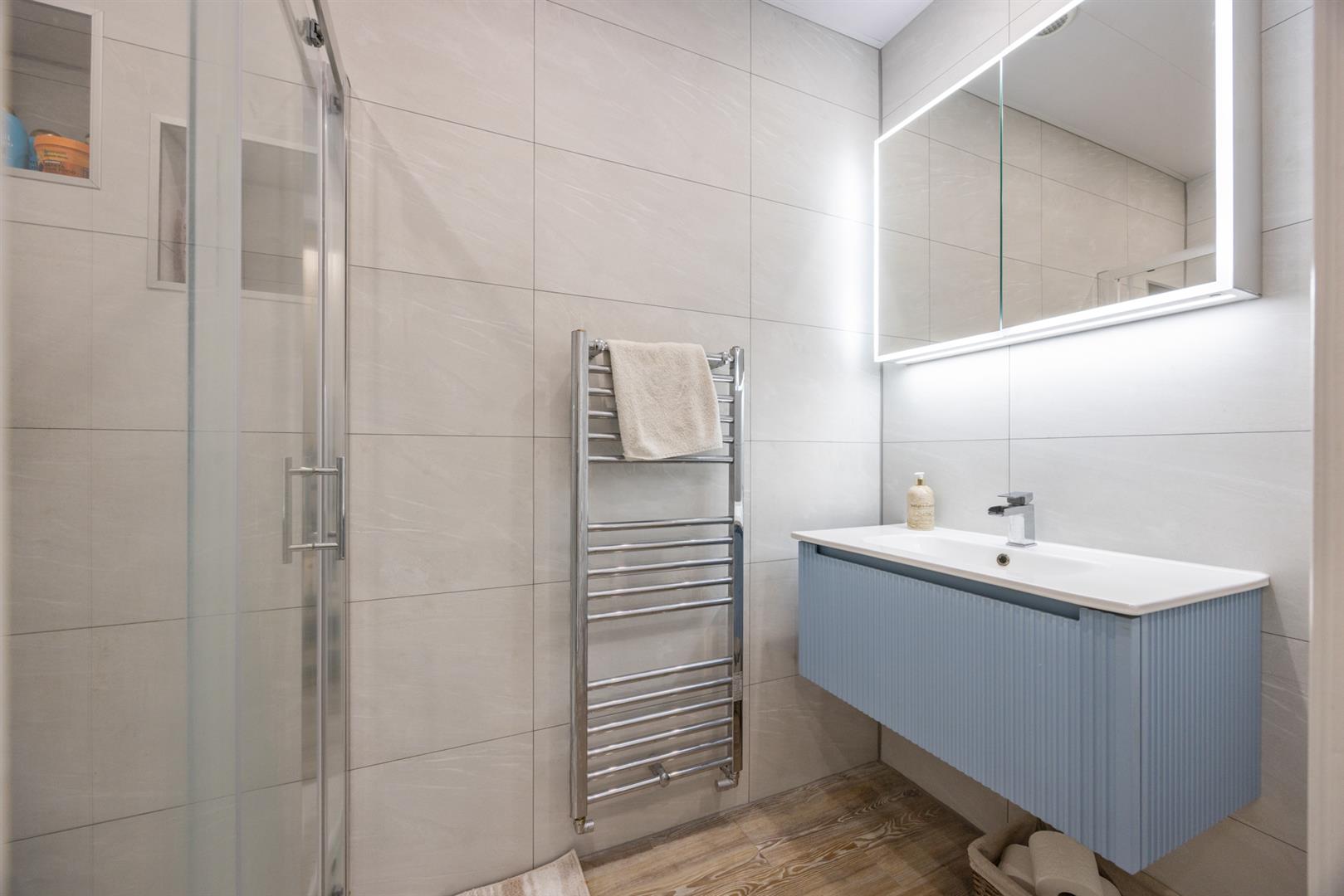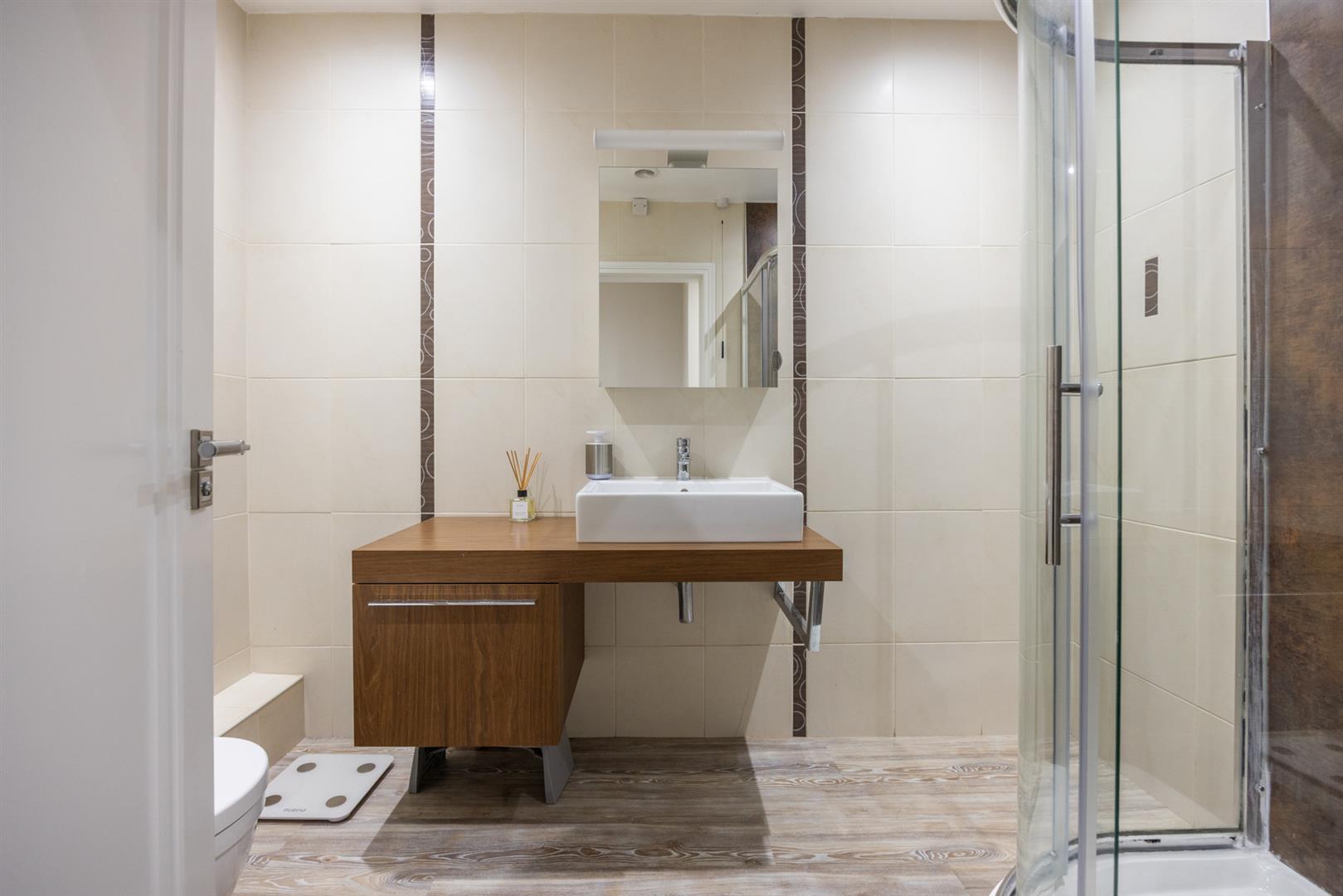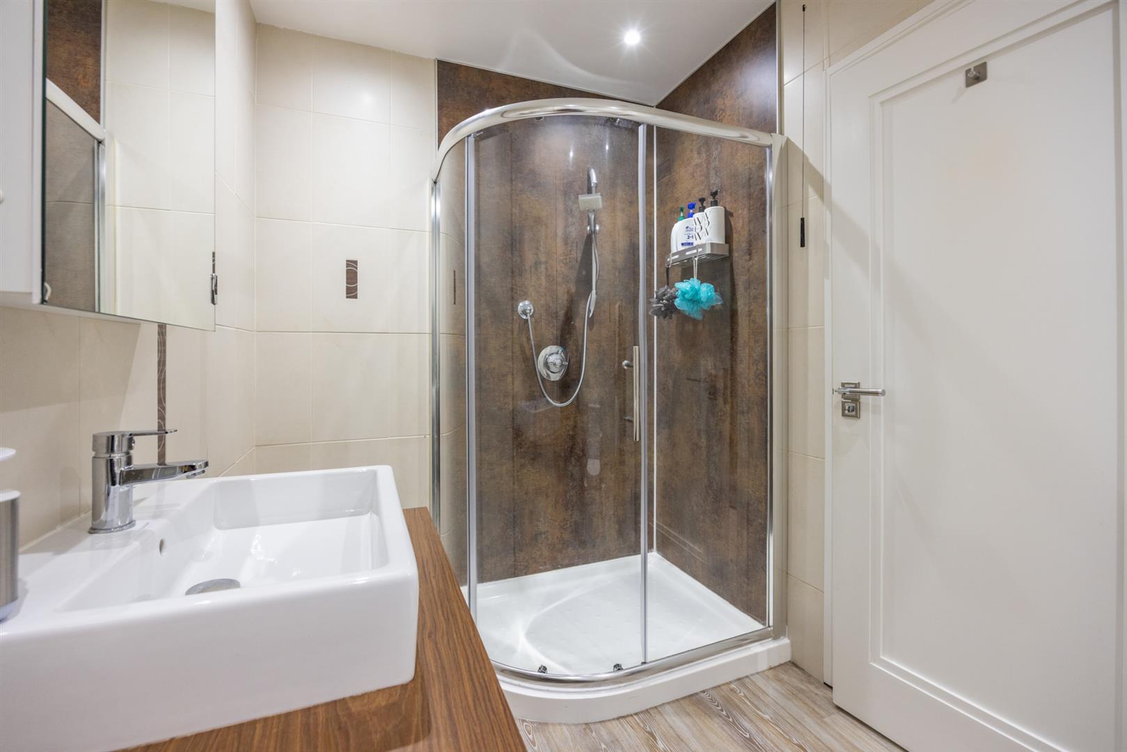 Contemporary, white, three piece suite comprising oversized shower enclosure, vanity unit and concealed cistern WC. Thermostat controlled mains shower unit with drench shower head. Tile effect panelling to walls. Chrome towel radiator. Wood laminate floor covering.