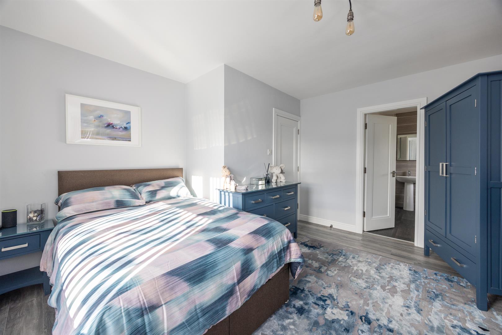 Range of fitted wardrobes and storage units. Balcony with views towards Cave Hill and Belfast Lough.