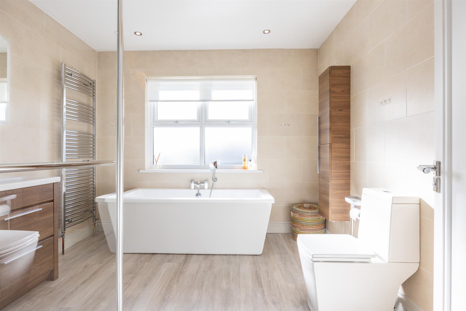 Contemporary, white, four piece suite comprising central mounted bath, separate, panelled shower enclosure with drying area, vanity unit and WC. Thermostat controlled main shower. Fully tiled walls. Chrome towel radiator. LVT flooring.