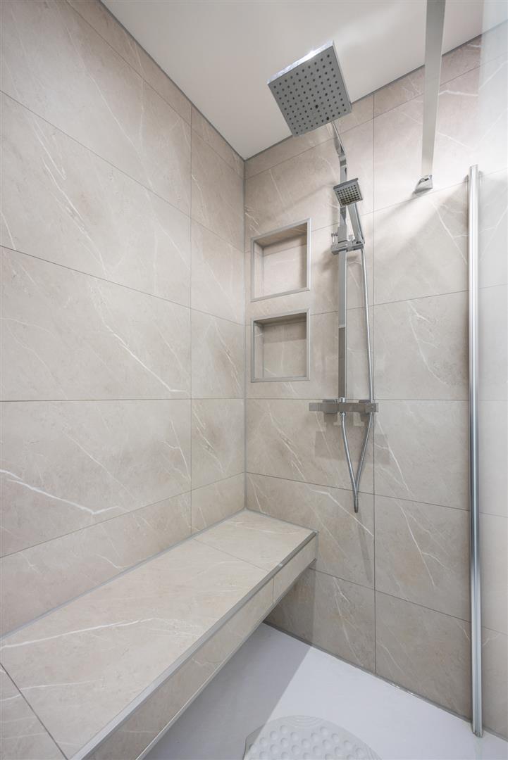 Contemporary, white, three piece suite comprising oversized shower enclosure, floating vanity unit and concealed cistern WC. Thermostat controlled mains shower unit with drench shower head. Chrome towel radiator. Tile effect panelling to walls. LVT flooring.