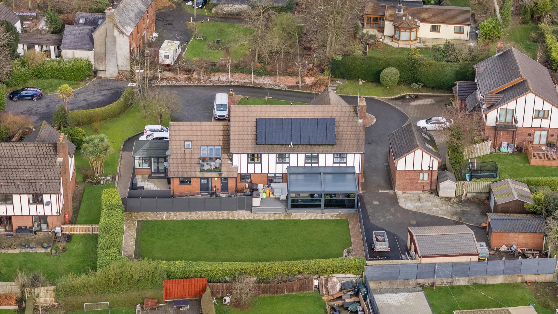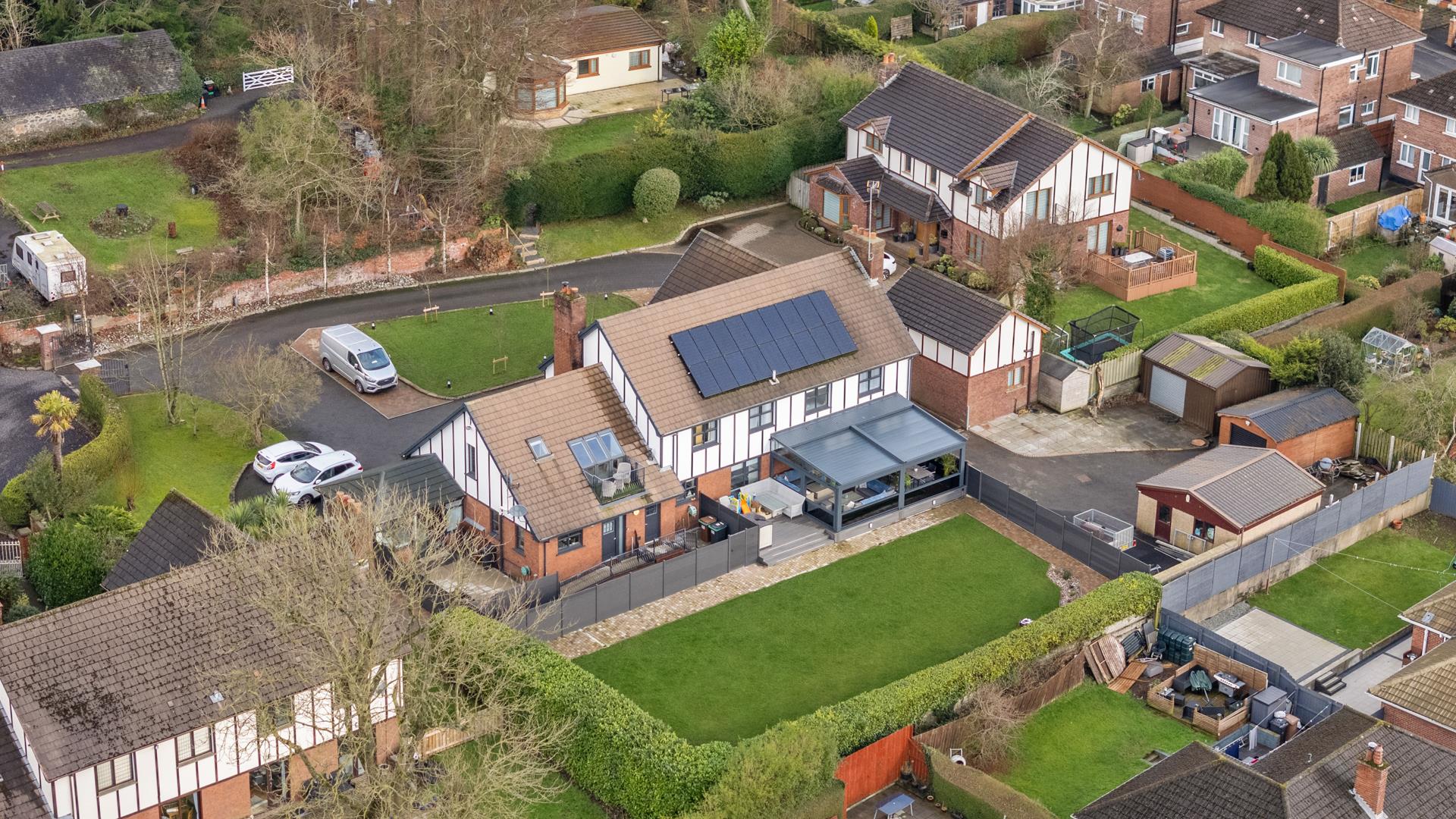 Other attributes include gas heating, PVC double glazing, solar panels, and extensive range of quality finishes throughout.