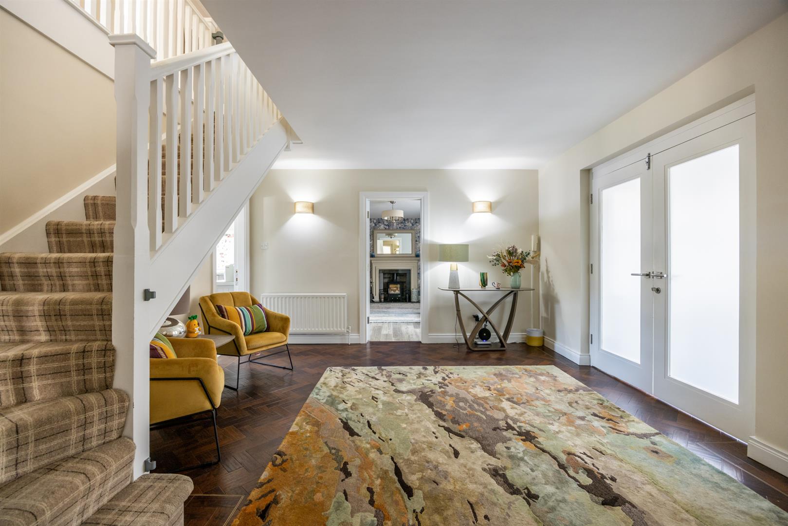 Karndean flooring. Stairwell to gallery landing. Glass panelled French doors leading to lounge.
