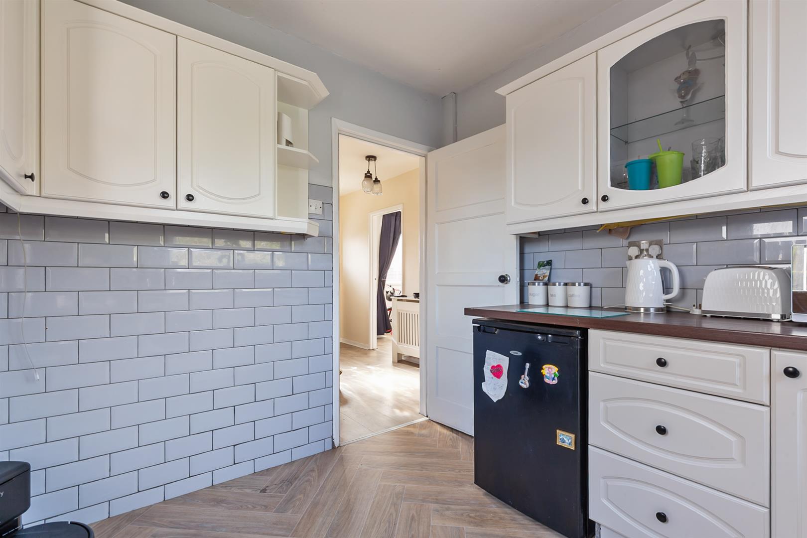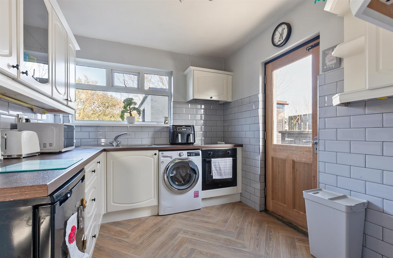 Modern fitted kitchen with range of high and low level storage units with contrasting wood grain effect melamine work surface. Stainless steel sink unit with draining bay. Integrated ceramic hob with extractor hood over. Integrated oven. Space for undercounter fridge. Plumbed and space for washing machine. Glass fronted display cabinet. Splashback tiling to walls. Hardwood double glazed door leading to rear garden.