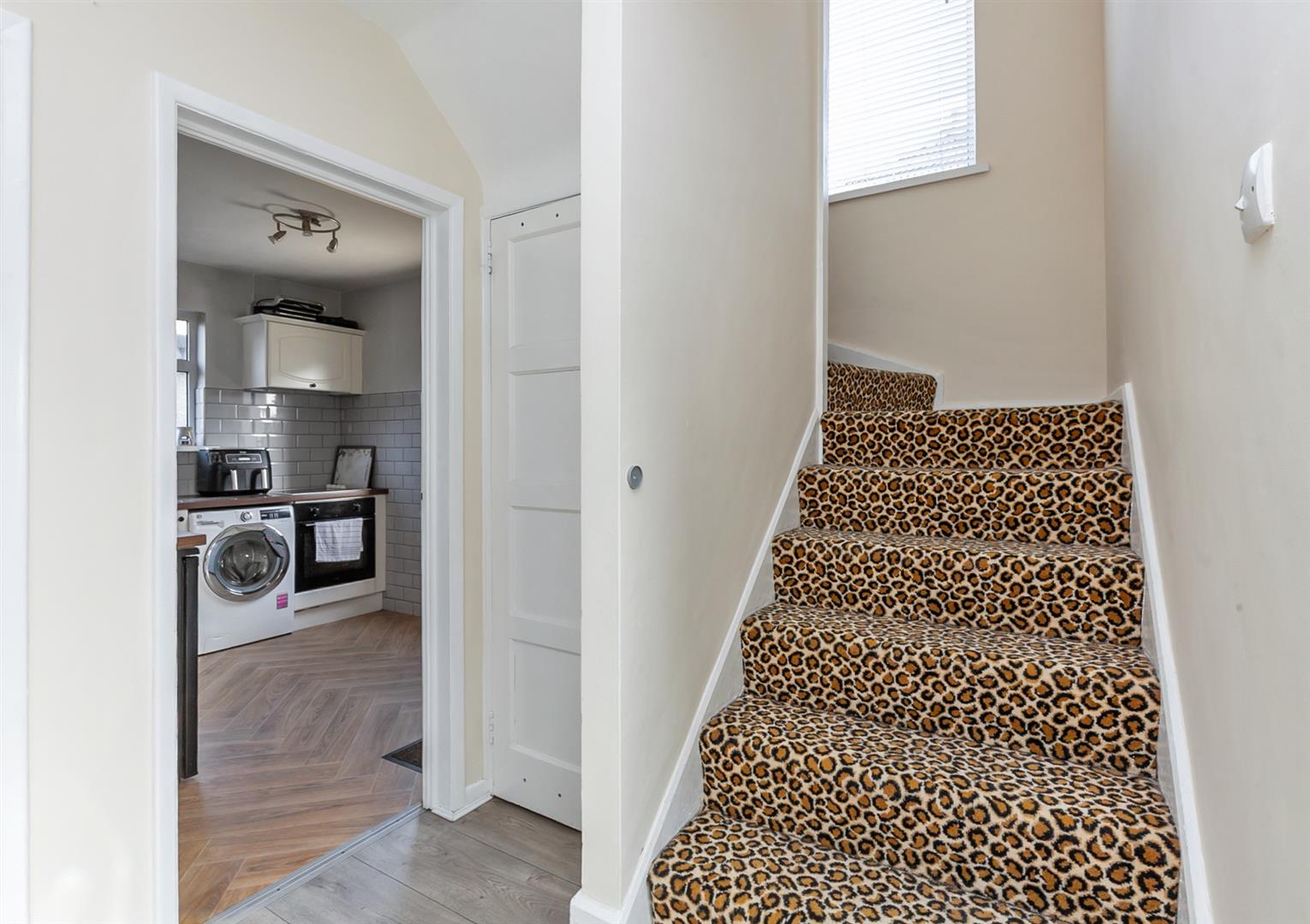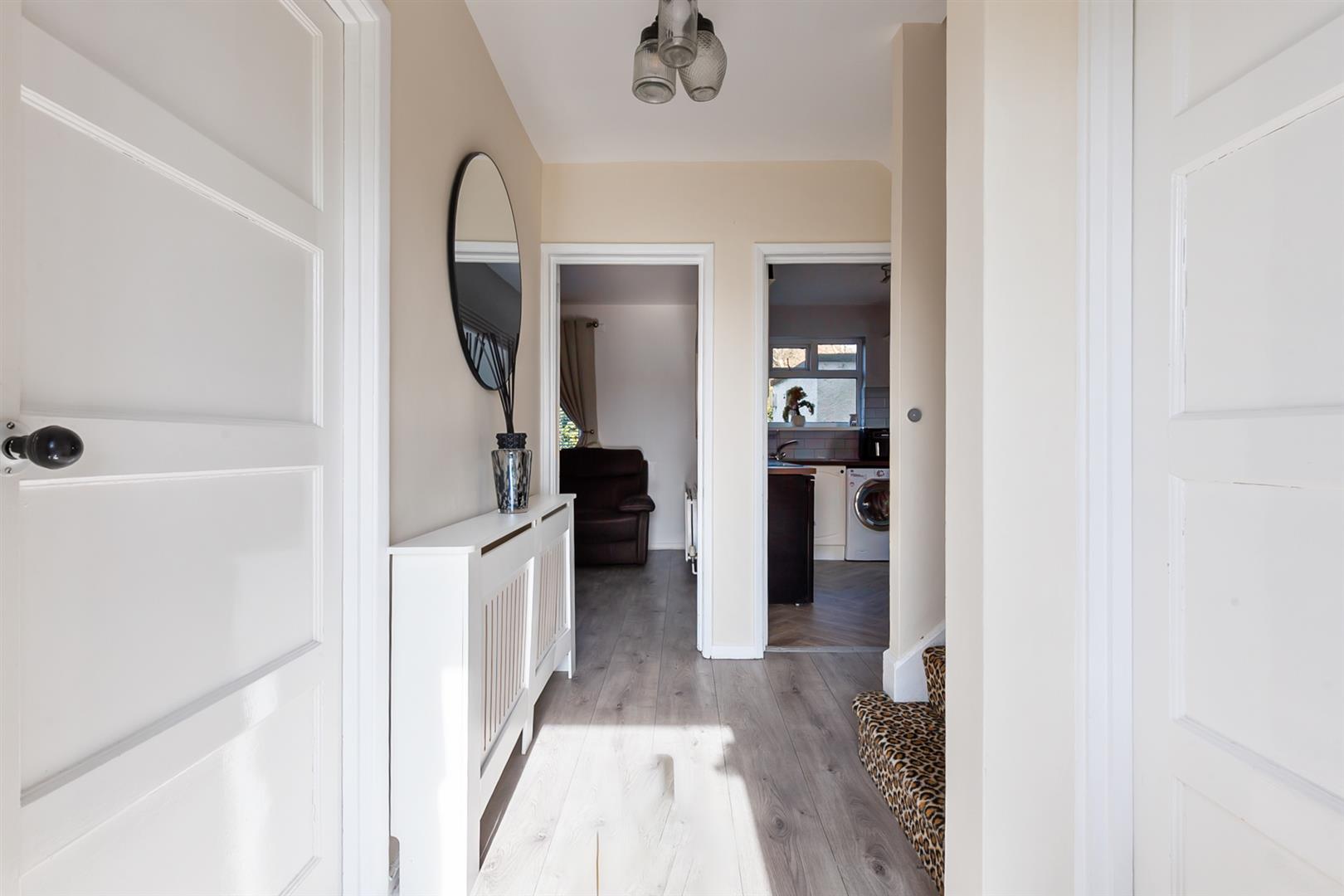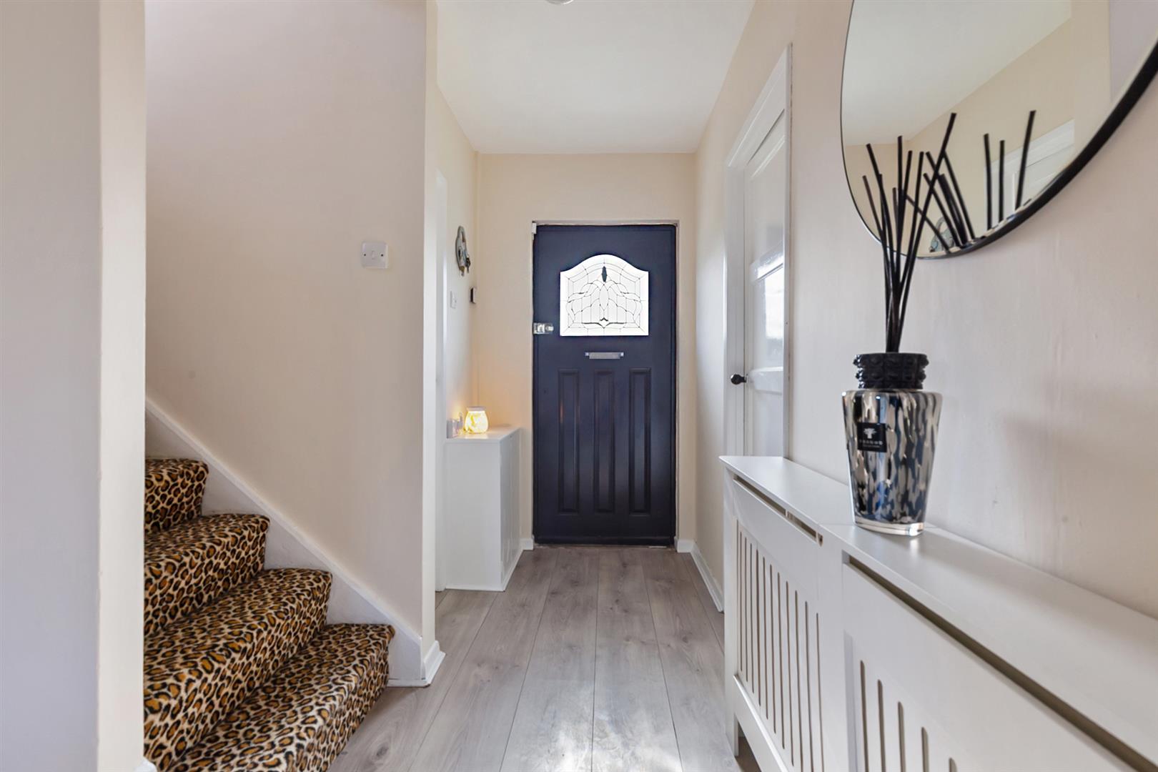 Hardwood glass panelled front door. Wood laminate floor covering. Stairwell to first floor. Access to under stairs store with power and light.