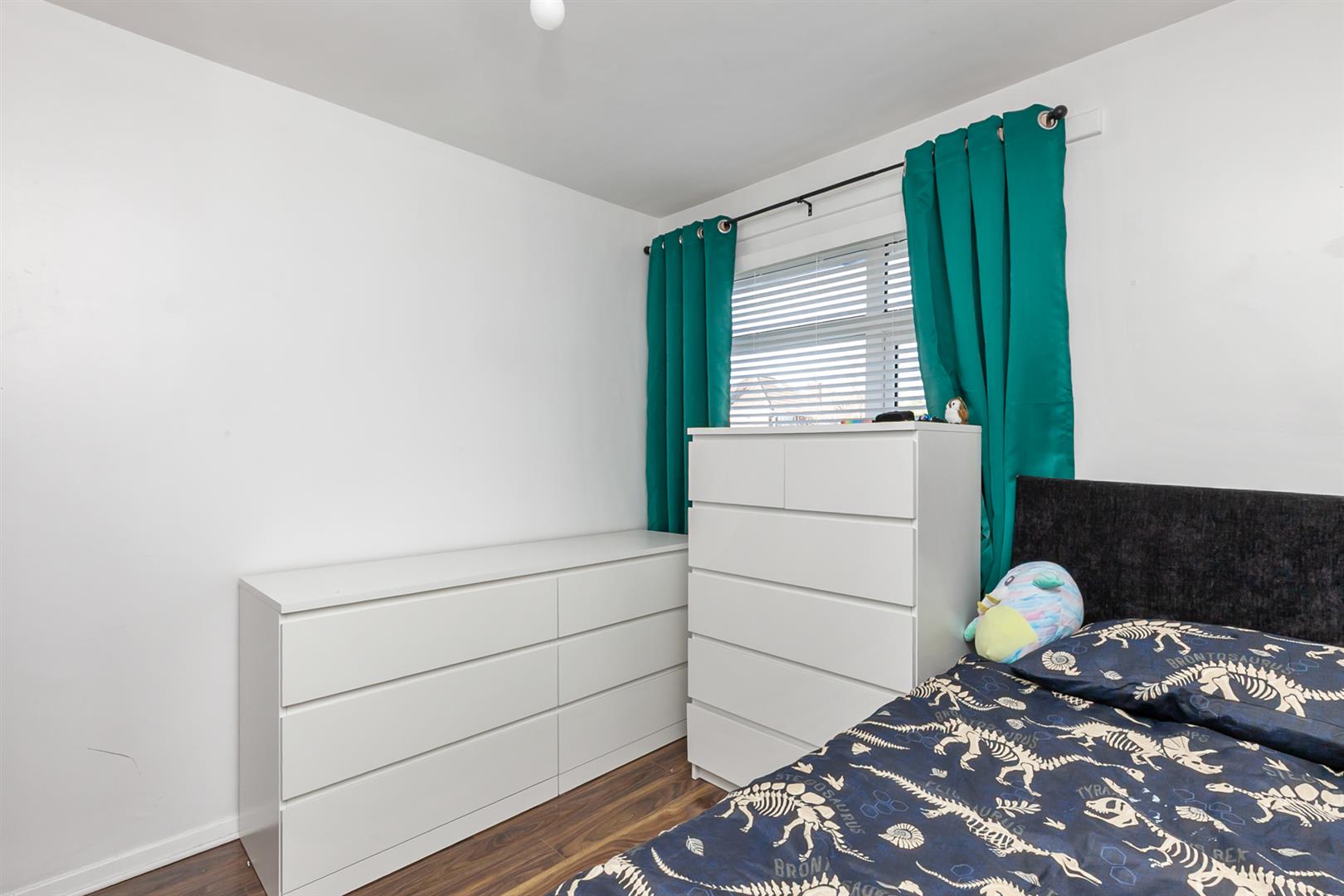 Built in wardrobe. Wood laminate floor covering.