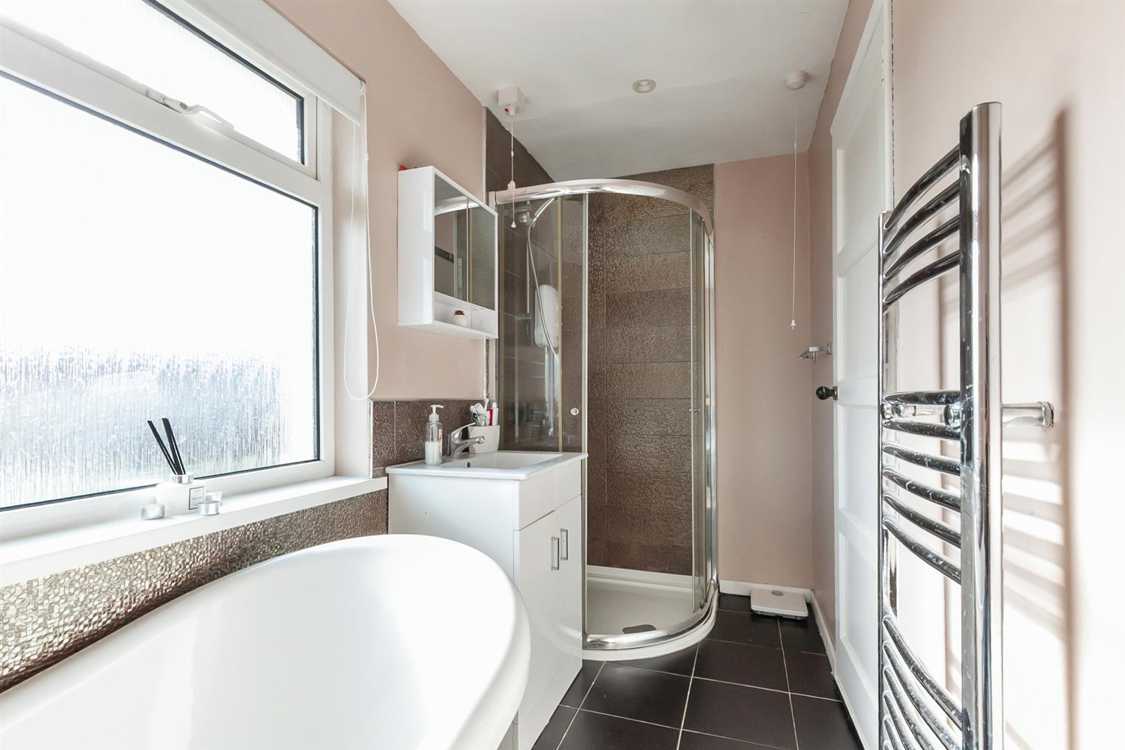 Contemporary, white, four piece suite comprising freestanding bath, separate fully tiled shower enclosure, vanity unit and WC. Electric shower. Splashback tiling to walls. Chrome towel radiator. Tiled floor.