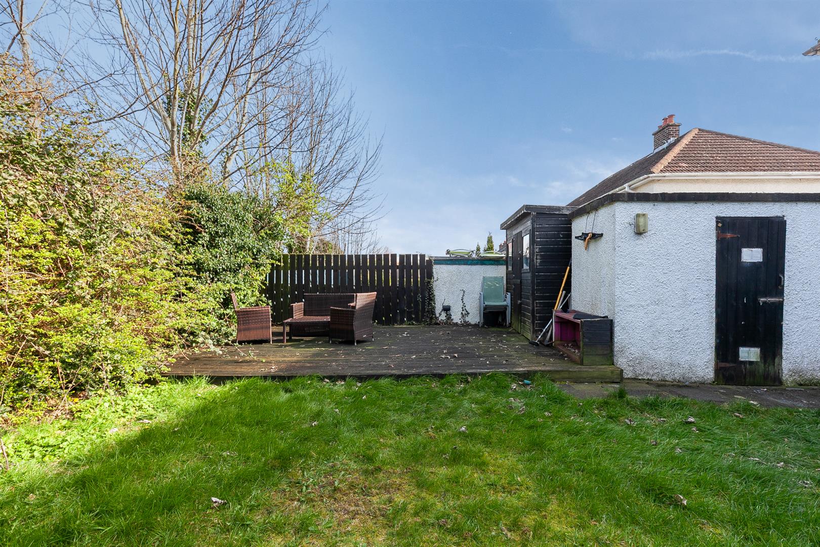 Fully enclosed rear garden finished in lawn and timber decking.