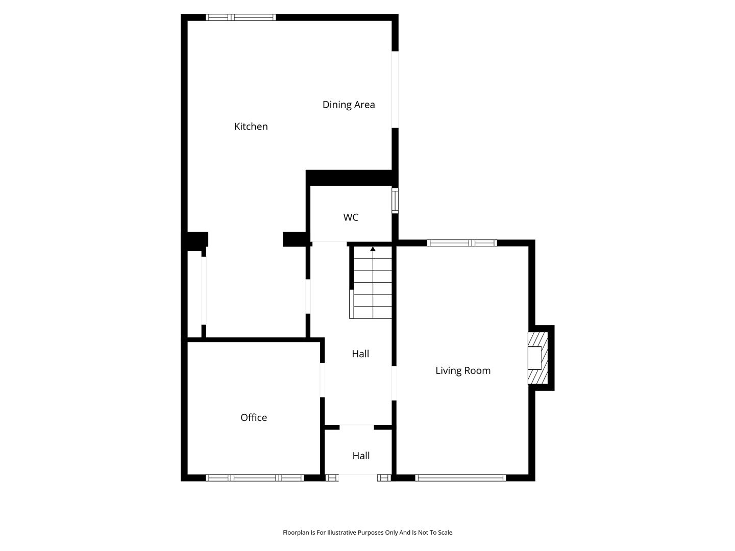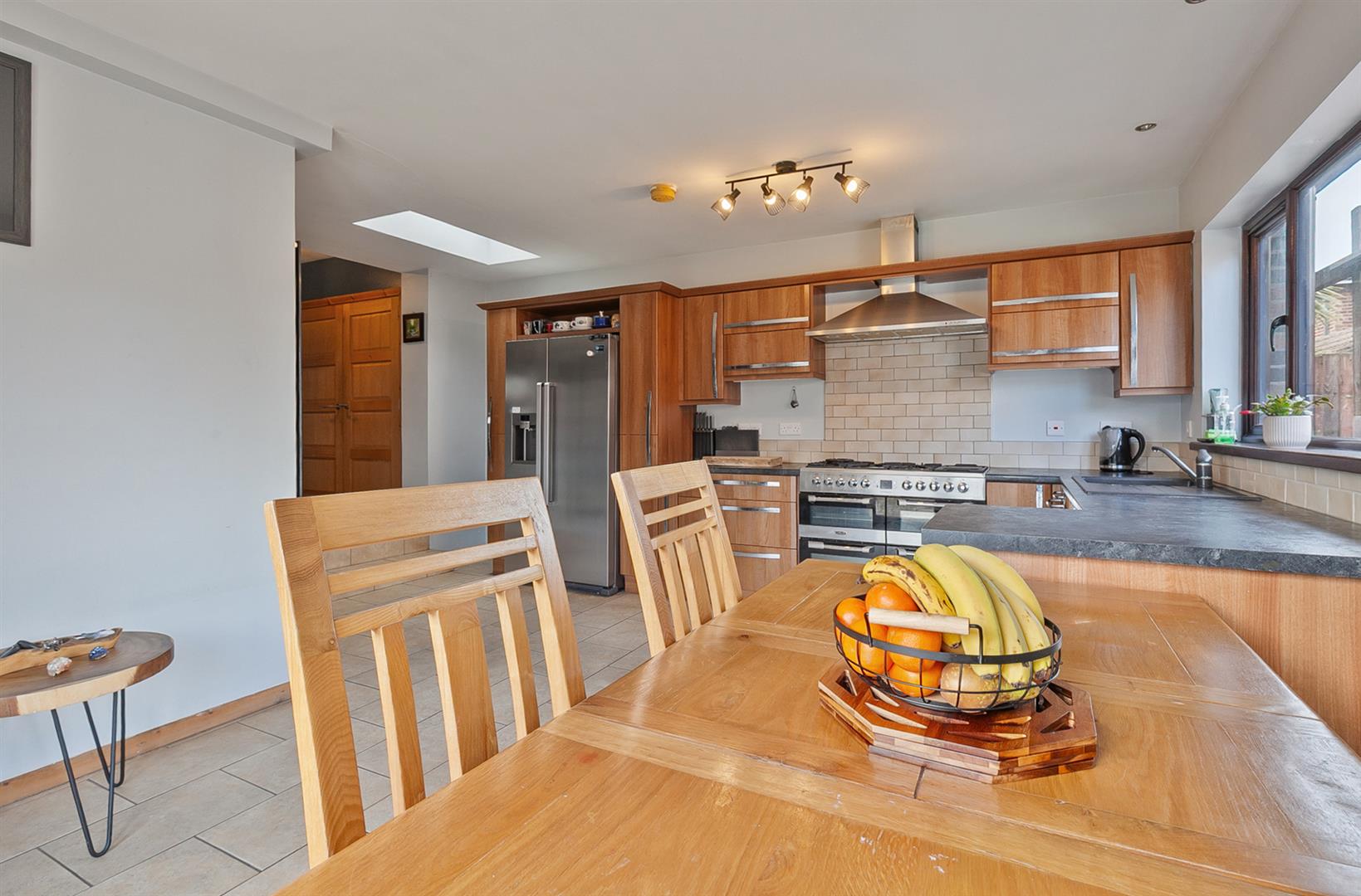 Dual aspect windows. Cast iron, multi fuel burning stove on granite hearth. Wood laminate floor covering.