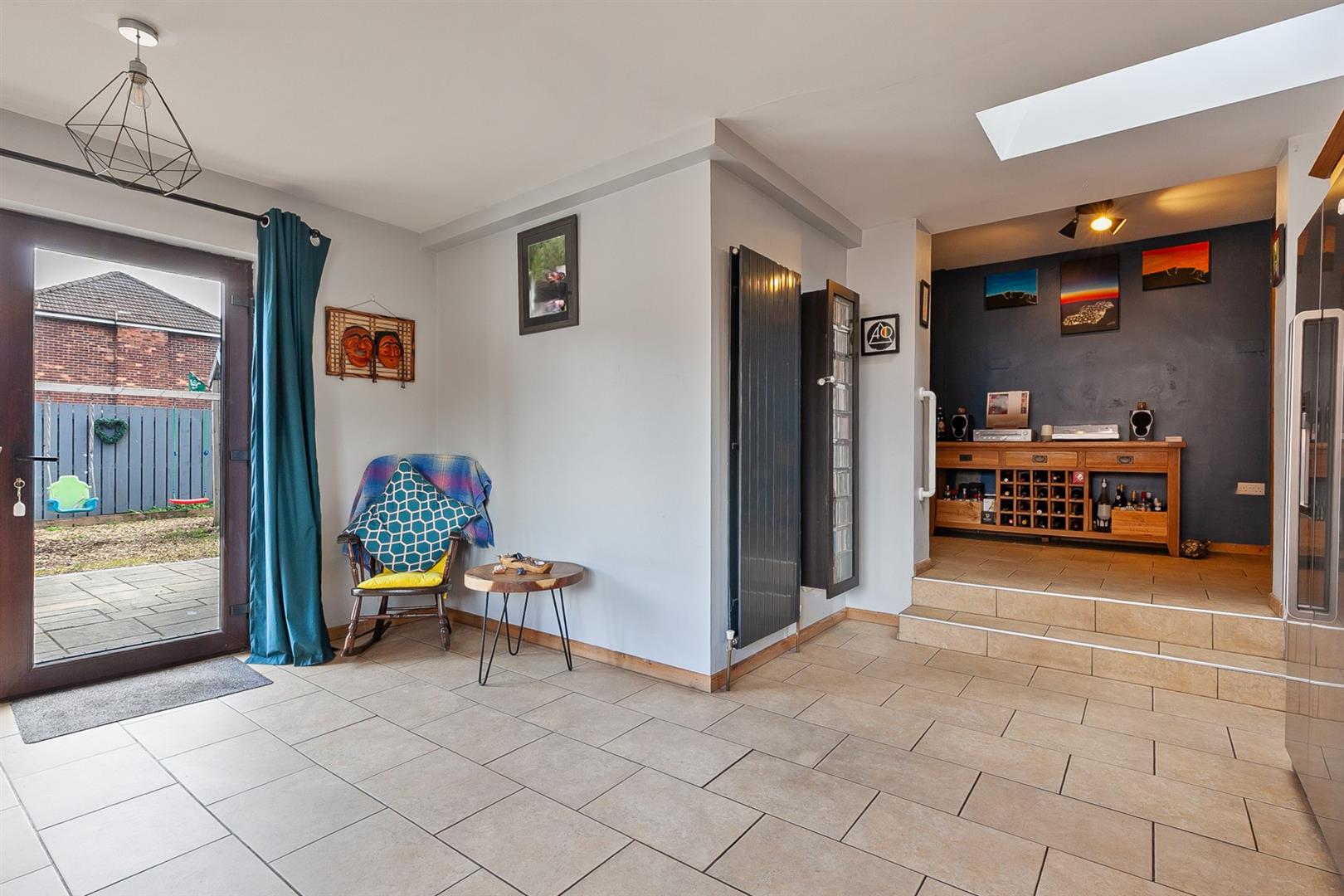 Tiled floor. Access to utility store with gas fired central heating boiler and plumbed for automatic washing machine. Open arch leading to: