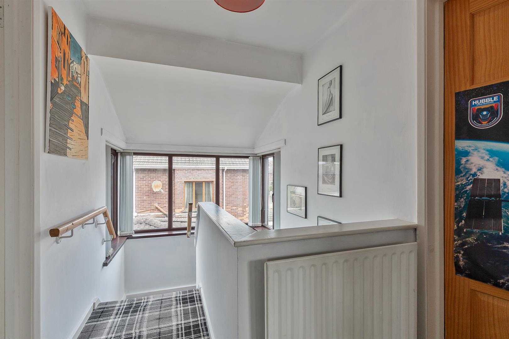 Wood laminate floor covering. Stairwell to first floor.