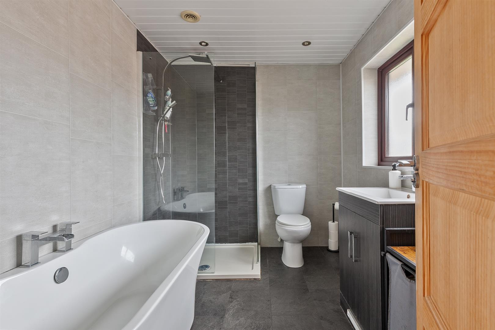 Contemporary, white, four piece suite comprising free standing bath, separate shower enclosure, vanity unit and WC. Thermostat controlled mains shower unit with drench shower head. Tile effect panelling to walls. Towel radiator. Tile effect flooring.
