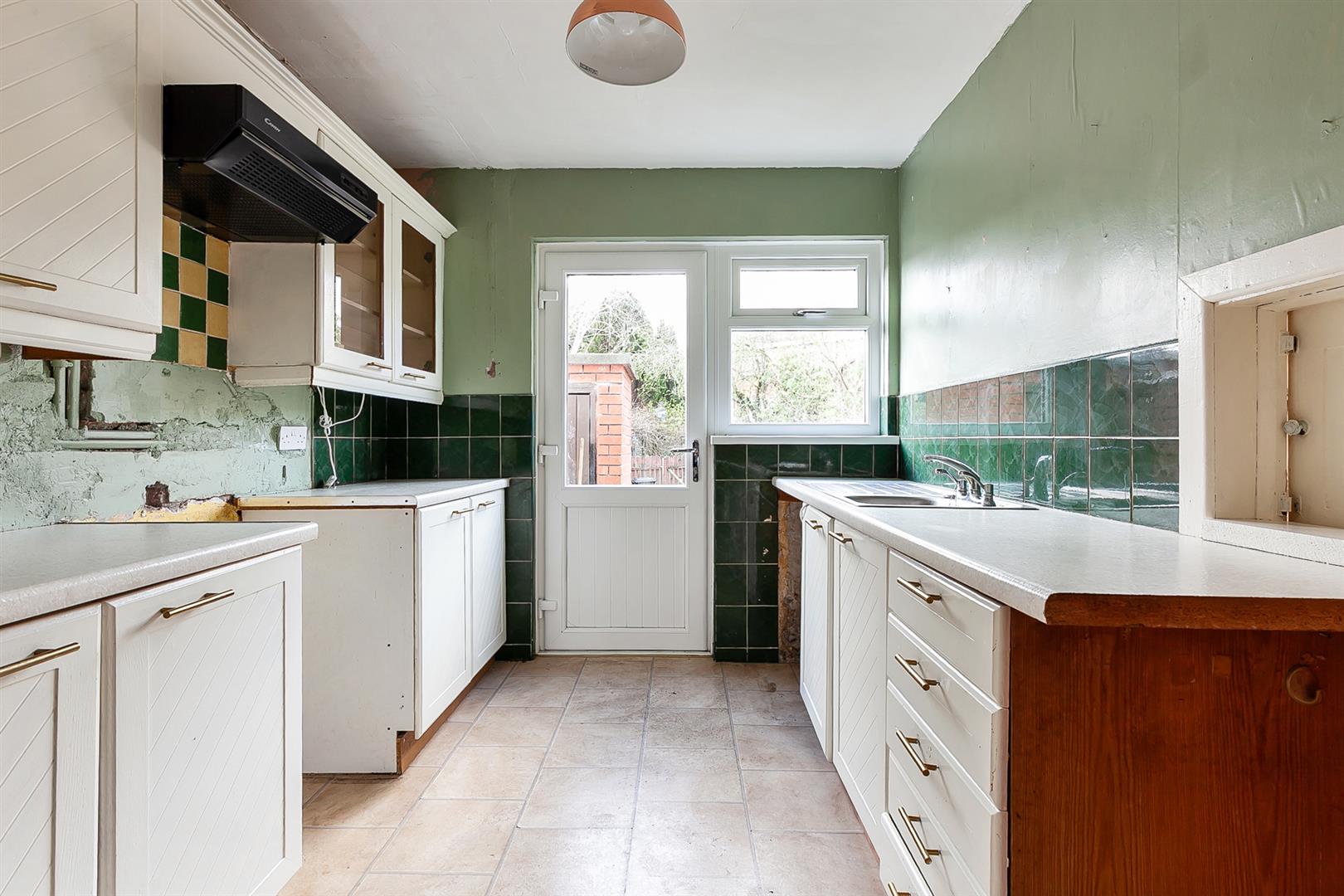 Fitted kitchen with range of high and low level storage units with contrasting melamine worktop. Stainless steel sink unit with draining bay. Cooker point with extractor hood over. Space for fridge freezer. Plumbed and space for washing machine. Twin glass fronted display cabinets. Splashback tiling to walls. Tile effect wood laminate floor covering. PVC double glazed door leading to rear garden.