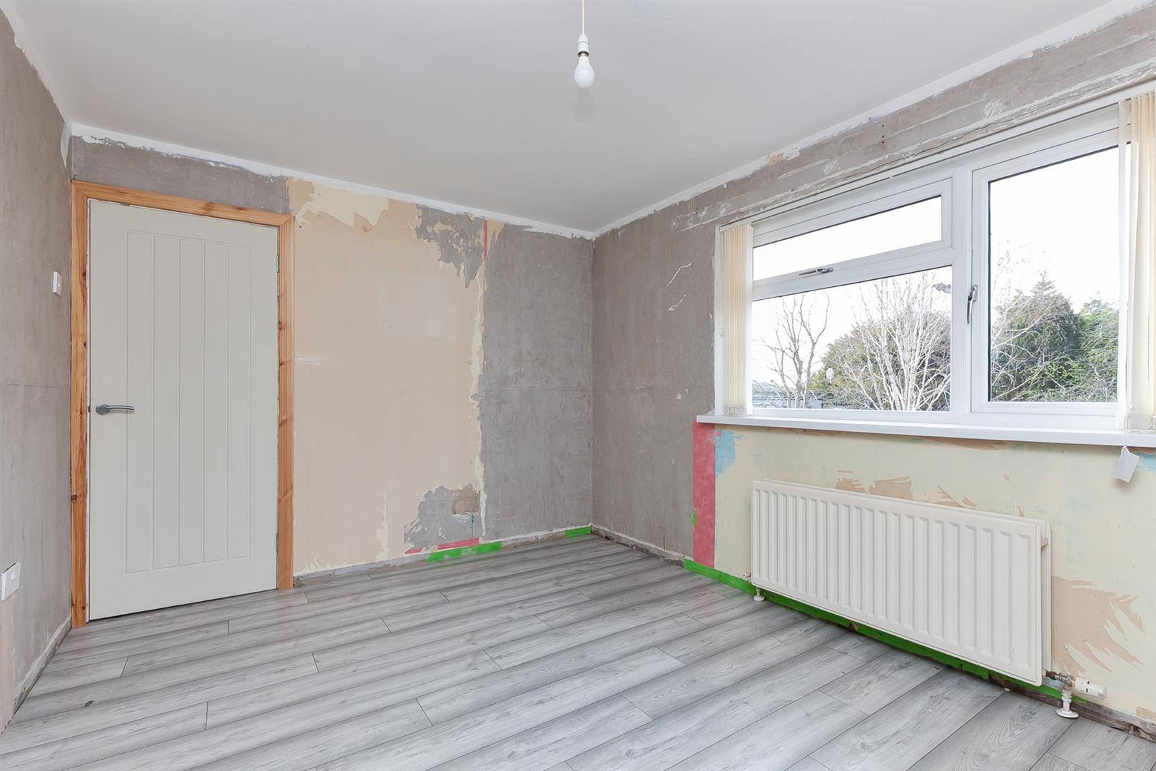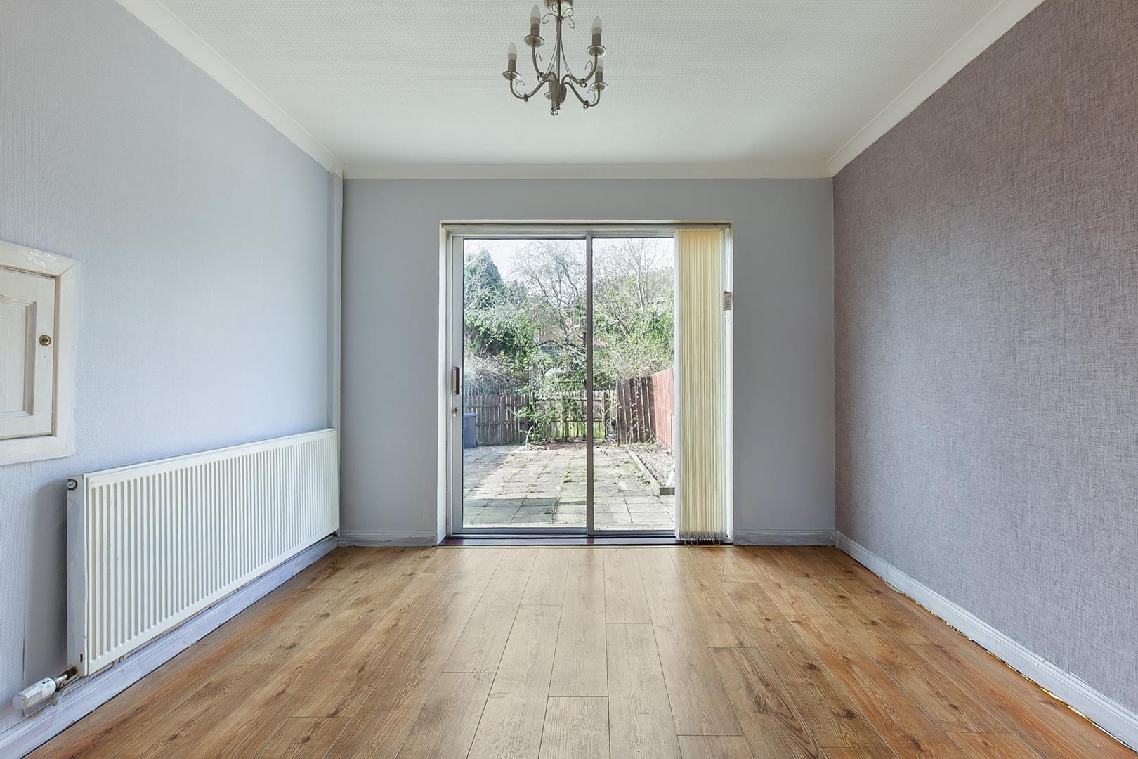 Wood laminate floor covering. Aluminium framed, double glazed, sliding patio door leading to rear garden.