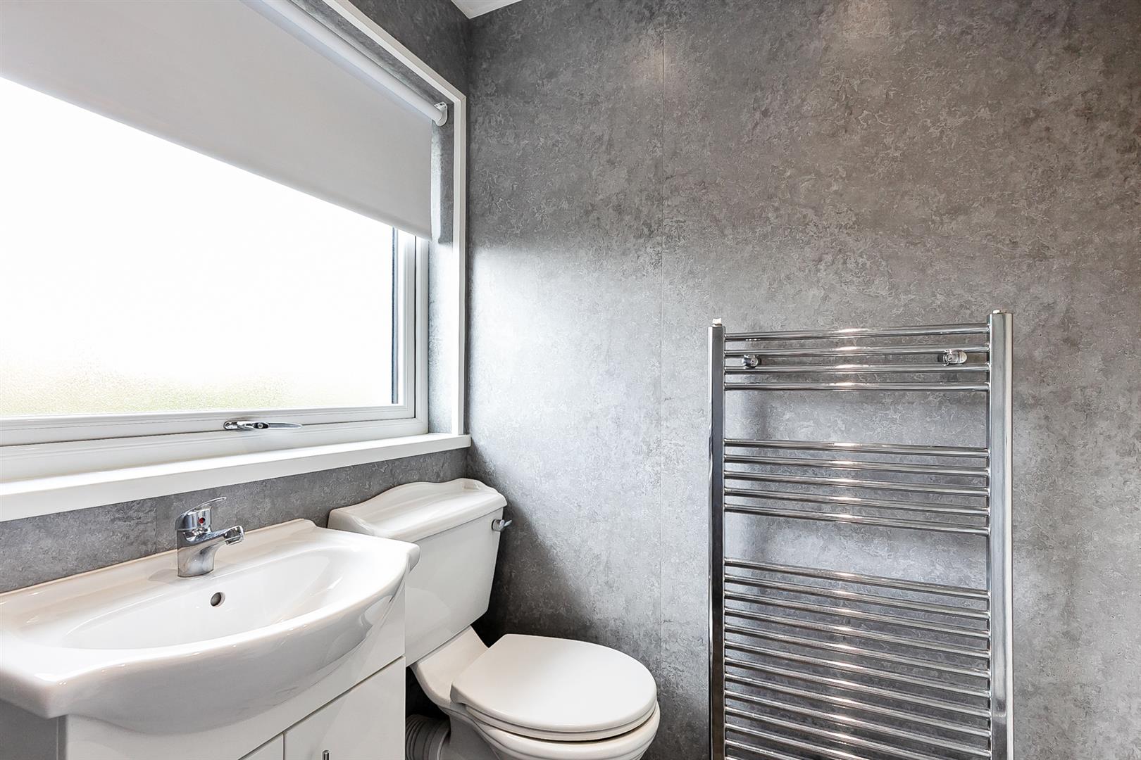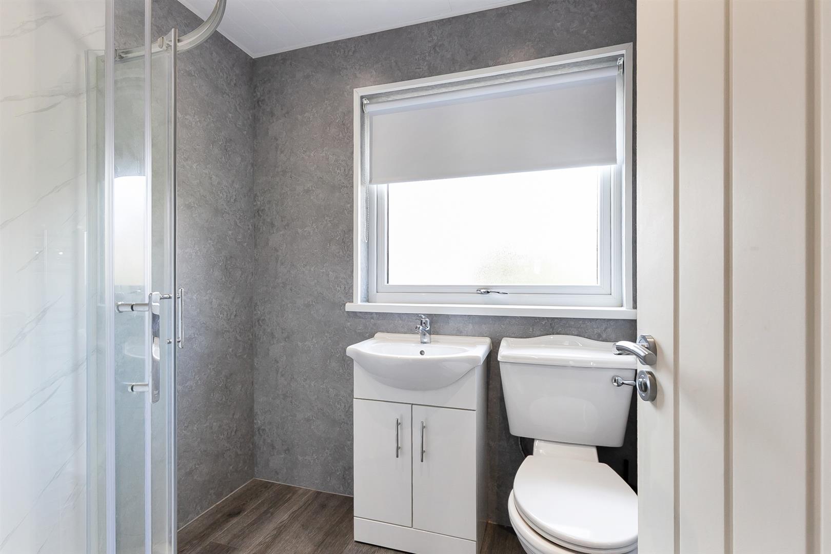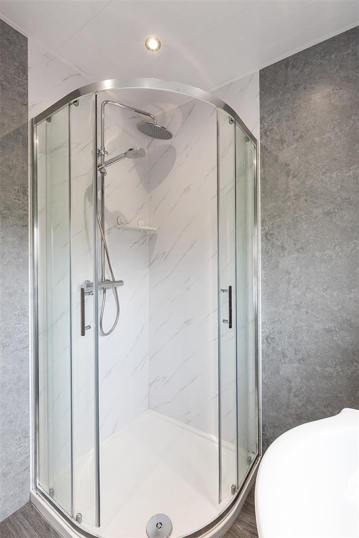 Contemporary, white, three piece suite comprising panelled shower enclosure, vanity unit and WC. Thermostat controlled main shower unit with drench shower head. Fully tiled walls. Chrome towel radiator. LVT flooring.