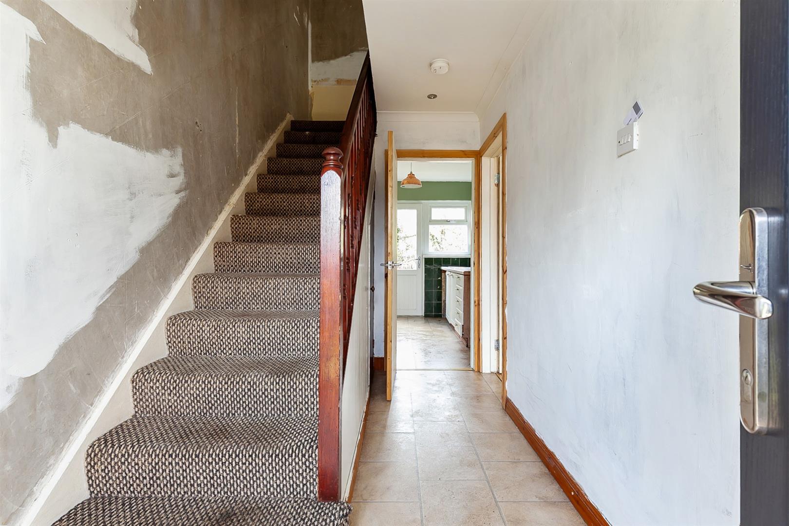 Composite, double glazed front door with PVC double glazed side screens. Tile effect wood laminate floor covering. Stairwell to first floor. Access to under stairs store.