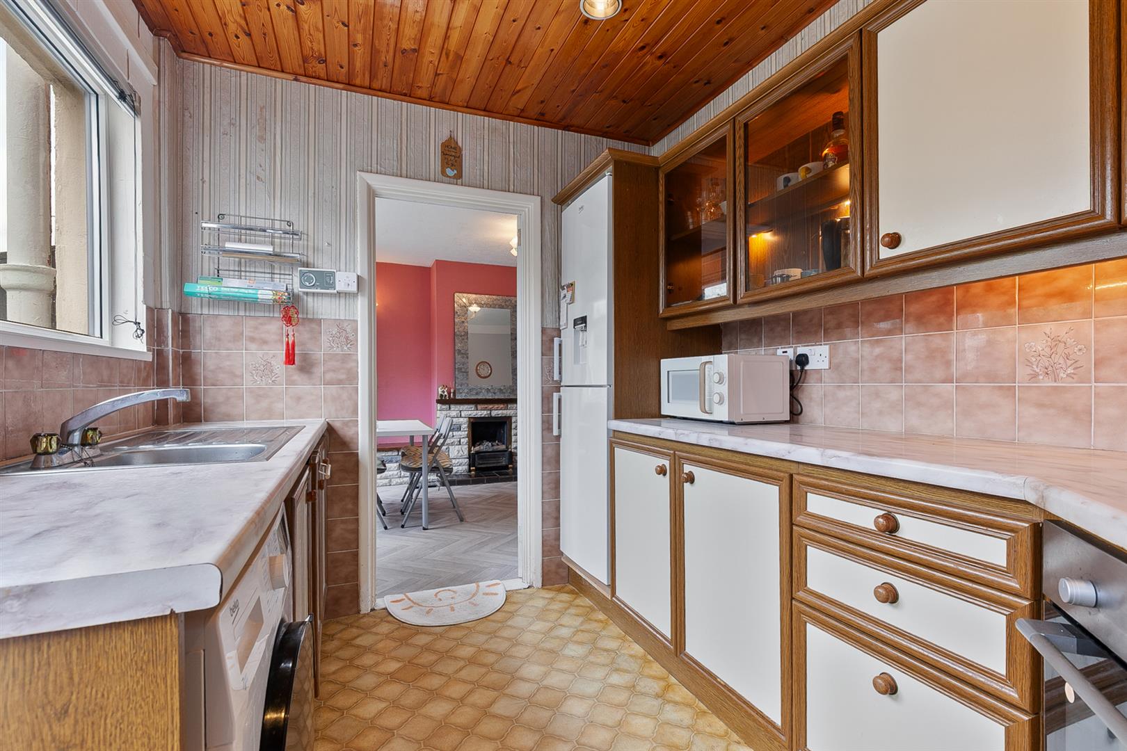 Fitted kitchen with range of high and low level storage units with contrasting marble effect melamine work surface. Stainless steel sink unit with draining bay. Integrated ceramic hob with extractor hood over. Integrated oven. Space for fridge freezer. Plumbed and space for washing machine. Glass fronted display cabinets. Half tiling to walls. PVC double glazed door leading to rear garden.
