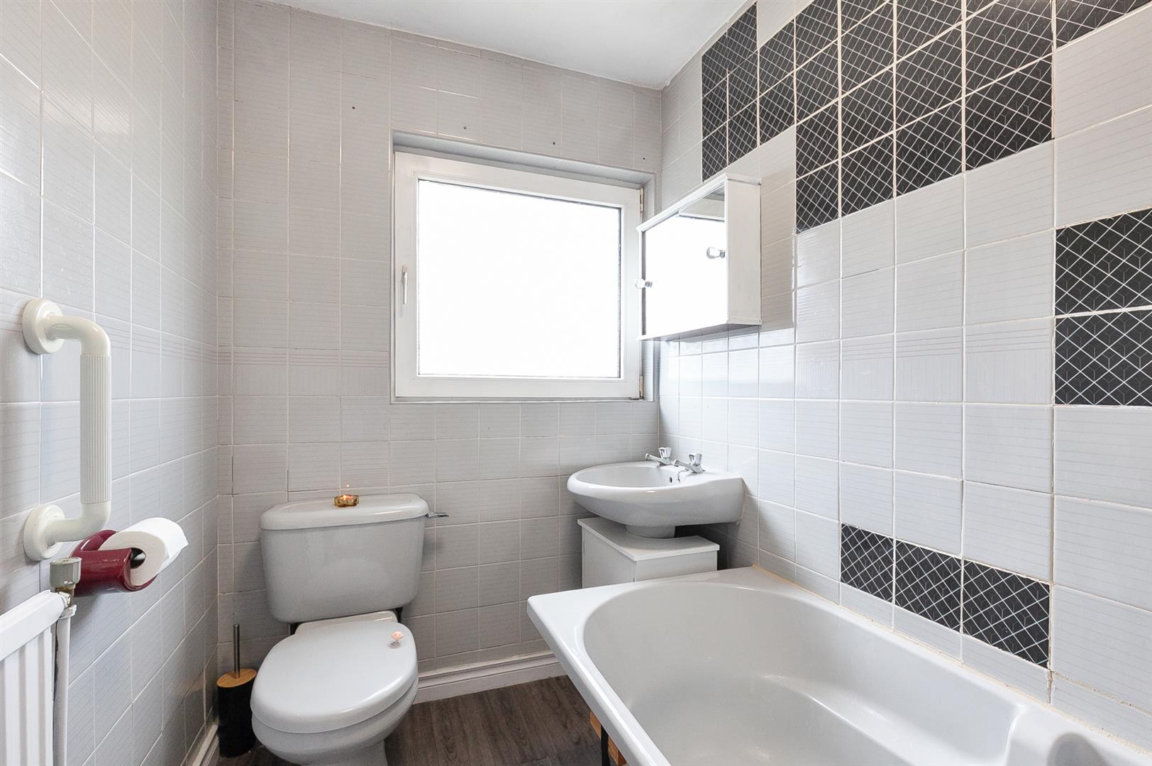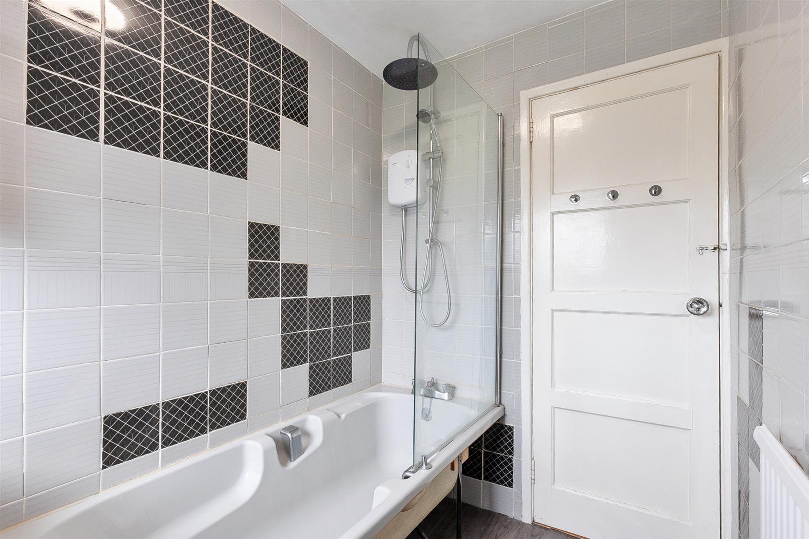 Three piece suite comprising bath, wash hand basin and WC. Electric shower with drench shower head and glass shower screen over bath. Fully tiled walls. LVT flooring.